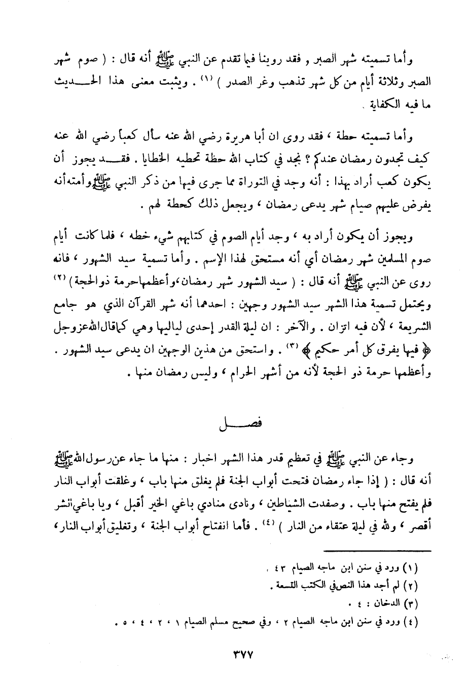 وأما تسميته شهر الصبر، فقد روينا فيما تقدم عن النبي صلى الله عليه وسلم أنه قال: (صوم شهر الصبر وثلاثة أيام من كل شهر تذهب وغر الصدر). ويثبت معنى هذا الحديث ما فيه الكفاية.