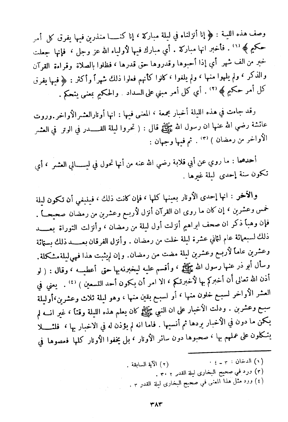 والآخر: أنها إحدى الأوتار بعينها كلها، فإن كانت ذلك، فينبغي أن تكون ليلة خمس وعشرين، إن كان ما روى أن القرآن أنزل لأربع وعشرين من رمضان صحيحًا. فإن وهبًا ذكر أن صحف إبراهيم أنزلت أول ليلة من رمضان، وأنزلت التوراة بعد ذلك لسبعمائة عام لثماني عشرة ليلة خلت من رمضان. وأنزل الفرقان بعد ذلك بستمائة وعشرين عامًا لأربع وعشرين ليلة مضت من رمضان. وإن لم يثبت هذا فهي ليلة مشكلة. وسأل أبو ذر عنها رسول الله صلى الله عليه وسلم، وأقسم عليه ليخبرنه بها حتى أعطيه، وقال: (لو أذن الله تعالى أن أخبركم بها لأخبرتكم، إلا أمر أن يكون أحد التسعين). يعني في العشر الأواخر لسبع خلون منها، أو لسبع بقين منها، وهو ليلة ثلاث وعشرين، أو ليلة سبع وعشرين. ودلت الأخبار على أن النبي صلى الله عليه وسلم كان يعلم هذه الليلة وقتًا، غير أنه لم يكن ما دون في الأخبار يردها ثم أنسيها. فأما أنه لم يؤذن له في الأخبار بها، فلئلا يتكلون على عملهم بها، صحبوها دون سائر الأوتار، بل يخفوا الأوتار كلها فعصوها في