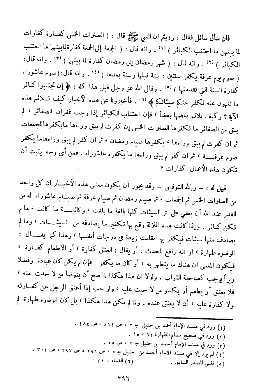 فإن سأل سائل فقال: رويتم أن النبي صلى الله عليه وسلم قال: (الصلوات الخمس كفارة كفارات لما بينهن ما اجتنب الكبائر). وأنه قال: (الجمعة إلى الجمعة كفارة لما ببينهما ما اجتنب الكبائر). وأنه قال: (شهر رمضان إلى رمضان كفارة لما بينهما). وأنه قال: (صوم يوم عرفة يكفر سنتين: سنة قبلها وسنة بعدها). وأنه قال: (صوم عاشوراء كفارة السنة التي تقدمتها). وقال الله عز وجل قبل هذا كله: {إن تجتنبوا كبائر ما تنهون عنه نكفر عنكم سيئاتكم}. فأخبرونا عن هذه الأخبار كيف تلائم هذه الآية؟ وكيف يلائم بعضها بعضًا، فإن اجتناب الكبائر إذا وجب غفران الصغائر، لم يبق من الصغائر ما تكفرها الصلوات الخمس إن كفرت لم يبق وراءها ما يكفرها للجمعات ثم أن كفرت لم يبق وراءها، يكفرها صيام رمضان، ثم أن كفر لم يبق وراءها ما يكفر صوم عرفة، ثم أن كفر لم يبق وراءها ما يكفره عاشوراء. فمن أي وجه يثبت أن تكون هذه الأعمال كفارات؟