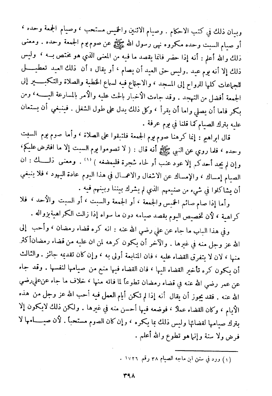 وبيان ذلك في كتب الأحكام. وصيام الاثنين والخميس مستحب، وصيام الجمعة وحده، أو صيام السبت وحده مكروه نهى رسول الله صلى الله عليه وسلم عن صوم يوم الجمعة وحده. لا ومعنى ذلك والله أعلم: أنه إذا حضر فإنما يقصد ما فيه من المعنى الذي هو مختص به، وليس ذلك إلا أنه يوم عيد. وليس حق العيد أن يصام، أو يقال: أن ذلك العيد تعطيل للجماعات كلها للرواح إلى المسجد، والاجتماع فيه لسماع الخطبة والصلاة والتكبير إلى الجمعة أفضل من التهجد. وقد جاءت الأخبار بالحث عليه والأمر بالمسارعة إليه، ومن بكر فإما أن يصلي وأما أن يقرأ، وكل ذلك يدل على طول الشغل. فينبغي أن يستعان عليه بترك الصيام كما قلنا في يوم عرفة.