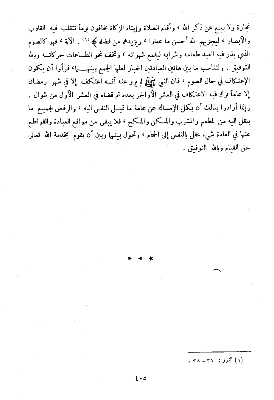 تجارة ولا بيع عن ذكر الله، وأقام الصلاة وإيتاء الزكاة يخافون يومًا تتقلب فيه القلوب والأبصار، ليجزيهم الله أحسن ما عملوا، ويزيدهم من فضله}. الآية، فهو كالصوم الذي يذر فيه العبد طعامه وشرابه ليقمع شهواته، وتخف نحو الطاعات حركاته وبالله التوفيق. ولتناسب ما بين هاتين العبادتين أخبار لعلها الجمع بينهما، فرأوا أن يكون الإعتكاف في حال الصوم، فإن النبي صلى الله عليه وسلم لم يرو عنه أنه اعتكف إلا في شهر رمضان إلا عامًا ترك فيه الاعتكاف في العشر الأواخر بعده ثم قضاه في العشر الأول من شوال.