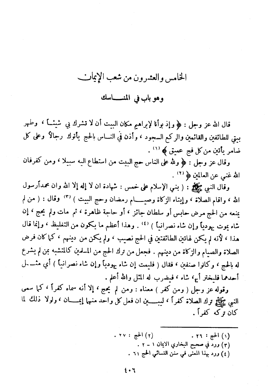 وقال النبي صلى الله عليه وسلم: {بني الإسلام على خمس: شهادة أن لا إله إلا الله وأن محمدًا رسول الله، وأقام الصلاة، وإيتاء الزكاة وصيام رمضان وحج البيت) وقال: (من لم يمنعه من الحج مرض حابس أو سلطان جائز، أو حاجة ظاهرة، ثم مات ولم يحج، إن شاء يموت يهوديًا وإن شاء نصرانيًا). وهذا أعظم ما يكون من التغليظ، وإنما قال هذا، لأنه لم يكن لهاتين الطائفتين في الحج نصيب، ولم يكن من دينهم، كما كان فرض الصلاة والصيام والزكاة من دينهم. فجعل من ترك الحج من المسلمين كالمتشبه بمن لم يشرع له بالحج، وكانوا صنفين، فقال (فليمت إن شاء يهوديًا وإن شاء نصرانيًا) أي مثل أحدهما فليختر أيها شاء، فيضرب له المثل والله أعلم.