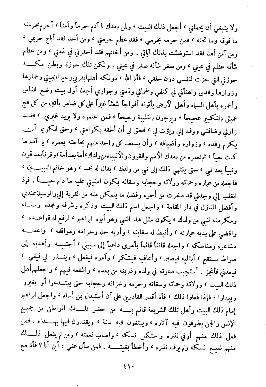 ولا ينبغي أن يحملني، أجعل ذلك البيت، ولمن بعدك يا آدم حرمًا وأمنًا، أحرم بحرمته ما فوقه وما تحته، فمن حرمه بحرمي، فقد عظم حرمتي، ومن أحله فقد أباح حريمي، ومن آمن أهله فقد استوضئت بذلك آياتي. ومن أخانهم فقد أحقرني في ذمتي، ومن عظم شأنه عظيم في عيني، ومن صغر شأنه صغر في عيني. ولكن تلك حوزة وبطن مكة حوزتي التي حزت لنفسي دون خلقي، فأنا الله، دونكه أهلها بقربي وجيران بيتي وعمارها وزوارها وفدى واهنأني في كنفي وضماني وذمتي وجواري أجعله أول بيت وضع للناس وأعمره بأهل السماء وأهل الأرض يأتونه أفواجًا شعثًا غبرًا على كل ضامر يأتين من كل فج عميق بالتكبير عجيجًا، ويرجون بالتلبية رجيحًا، فمن اعتمره ولا يريد غيري، فقد زارني وضافني ووفد إلى ويؤت لي، فحق لي أن ألحقه بكرامتي، وحق الكريم أن يكرم وفده، وزواره وأضيافه، وأن يسعف كل واحد منهم بحاجته يعمره، يا آدم ما كنت حيًا، ثم تعمره من بعدك الأمم والقرون والأنبياء من ولدك، أمة بعد أمة، وقرنًا بعد قرن ونبيًا بعد نبي، حتى ينتهي ذلك إلى نبي من ولدك، يقال له محمد، وهو خاتم النبيين، فاجعله من عماره وحماته وولاته وحجابه وسقائه يكون أمنيتي عليه ما دام حيًا. فإذ انقلب إلي وجدني قد دخرت من أجره وفضله ما يتمكن منه من القربة إلي والوسيلة عندي وأفضل المنازل في دار المقامة، واجعل اسم ذلك البيت وذكره وشرفه ومجده وسناه ومكرمته لنبي من ولدك، يكون مثل هذا النبي وهو أبوه إبراهيم، ارفع له قواعده، واقضي على يديه عمارته، وأنيط له سقايته، وأريه حله وحرامه ومواقفه، واعلمه مشاعره ومناسكه، واجعله قانتًا قائمًا بأمري داعيًا إلى سبيلي، أجتبيه وأهديه إلى صراط مستقيم، أبتليه فيصبر، وأعافيه فيشكر، وآمره فيفعل، وينذر لي فيفي، فيعدني فأنجز. أستجيب دعوته في ولده وذريته من بعده، واشفعه فيهم، واجعلهم أهل ذلك البيت، وولاته وحماته وسقاته وحرمه وخزانه وحجابه حتى يبتدعوا أو يغيروا ويبدلوا، فإذا فعلوا ذلك، فأنا أقدر القادرين على أن أستبدل بمن أساء، واجعل إبراهيم إمام ذلك البيت وأهل تلك الشريعة قائم به من حضر تلك المواطن من جميع الإنس والجن يطوفون فيه آثاره، ويبتغون فيه سنة، ويقتدون فيها بهداه. فمن فعل ذلك منهم أوفي نذره واستكمل نسكه، وأصاب نعتمه، ومن لم يفعل ذلك منهم ضيع نسكه ولم يوف نذره، وأخطأ بغيته. فمن سأل عني: أين أنا؟ فأنا مع