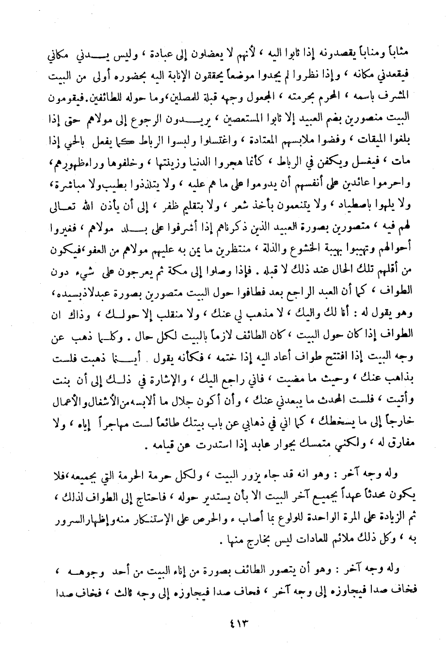 مثابًا ومنابًا يقصدونه إذا ثابوا إليه، لأنهم لا يعضلون إلى عبادة، وليس يدني مكاني فيقعدني مكانه، وإذا نظروا لم يجدوا موضعًا يحققون الإنابة إليه بحضوره أولى من البيت المشرف باسمه، الحرم بحرمته، المجعول وجهه قبلة للمصلين، وما حوله للطائفين. فيقومون البيت منصورين بضم العبيد إلا ثابوا المستعصين، يريدون الرجوع إلى مولاهم حتى إذا بلغوا الميقات، وفضوا ملابسهم المعتادة، واغتسلوا ولبسوا الرباط كما يفعل بالحي إذا مات، فيغسل ويكفن في الرباط، كأنما هجروا الدنيا وزينتها، وخلفوها وراء ظهورهم، واحرموا عائدين على أنفسهم أن يدوموا على ما هم عليه، ولا يتلذذوا بطيب ولا مباشرة، ولا يلهوا باصطياد، ولا يتنعمون بأخذ شعر، ولا بتقليم ظفر، إلى أن يأذن الله تعالى لهم فيه، متصورين بصورة العبيد الذين ذكرناهم إذا أشرفوا على بلد مولاهم، فغيروا أحوالهم وتهيبوا بهيبة الخشوع والذلة، منتظرين ما يمن به عليهم مولاهم من العفو، فيكون من أقلهم تلك الحال عند ذلك لا قبله. فإذا وصلوا إلى مكة ثم يعرجون على شيء دون الطواف، كما أن العبد الراجع بعد فطافوا حول البيت متصورين بصورة عبد لاذ بسيده، وهو يقول له: أن لك وإليك، لا مذهب لي عنك، ولا منقلب إلا حولك، وذاك أن الطواف إذا كان حول البيت، كان الطائف لازمًا بالبيت لكل حال. وكلما ذهب عن وجه البيت إذا افتتح طواف أعاد إليه إذا ختمه، فكأنه يقول: أينما ذهبت فلست بذاهب عنك، وحيث ما مضيت، فإني راجع إليك، والإشارة في ذلك إلى أن بنت وأتيت، فلست المحدث ما يبعدني عنك، وأن أكون جلال ما ألابسه من الأشغال والأعمال خارجًا إلى ما يسخطك، كما أني في ذهابي عن باب بيتك طائعًا لست مهاجرًا إياه، ولا مفارق له، ولكني متمسك بجوار عابد إذا استدرت عن قيامه.