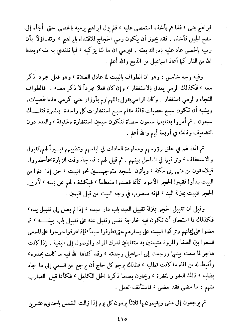 إبراهيم بمنى، فلما هم بأخذه استعصى عليه، فلم يزل إبراهيم يرميه بالحصى حتى ألجأه إلى سفح الجبل فأخذه. فقد يجوز أن يكون رمي الحجاج للاقتداء بإبراهيم، وتفاؤلاً بأن رميه بالحصى عاد عليه بادراك بعثه. فيرمي أن ما لنا يزكيه، فيما نقتدي به منه، ويعذنا الله من النار كما أعاذ إسماعيل من الذبح والله أعلم.