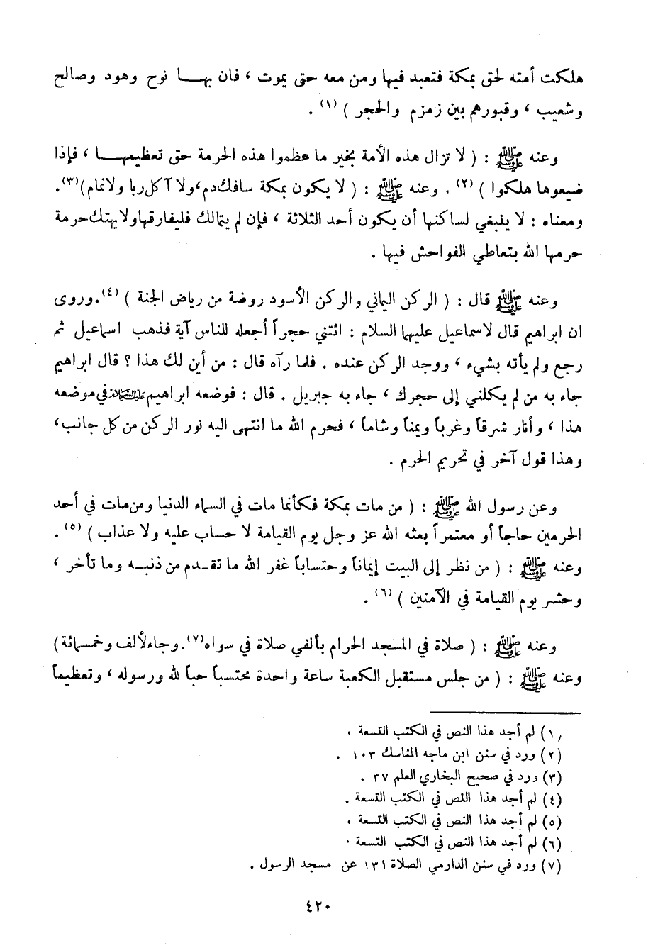 وعنه صلى الله عليه وسلم: (لا تزال هذه الأمة بخير ما عظموا هذه الحرمة حق تعظيمها، فإذا ضيعوها هلكوا). وعنه صلى الله عليه وسلم: (لا يكون بمكة سافك دم، ولا آكل ربا ولا نمام). ومعناه: لا ينبغي لساكنها أن يكون أحد الثلاثة، فإن لم يتمالك فليفارقها ولا يهتك حرمة حرمها الله بتعاطي الفواحش فيها.