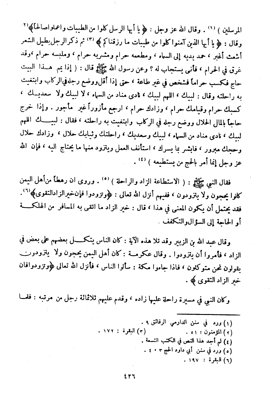 المرسلين). وقال الله عز وجل: {يا أيها الرسل كلوا من الطيبات واعملوا صالحًا} وقال: {يا أيها الذين آمنوا كلوا من طيبات ما رزقناكم} ثم ذكر الرجل يطيل الشعر أشعث أغبر، حمد يديه إلى السماء، ومطعمه حرام ومشربه حرام، وملبسه حرام، وقد غرق في الحرام، فأني يستجاب له؟ وعن رسول الله صلى الله عليه وسلم قال: (إذا يمم هذا البيت حاج فكسب حرامًا فشخص في غير طاعة، حتى إذا أقل ووضع رجله في الركاب وابتغيت به راحلته وقاله: لبيك، اللهم لبيك، نادي مناد من السماء، لا لبيك ولا سعديك، كسبك حرام وقيامك حرام، وزادك حرام، ارجع مأزورًا غير مأجور. وإذا خرج حاجًا بالمال الحلال ووضع رجله في الركاب وابتغيت به راحلته، فقال: لبيك اللهم لبيك، نادي مناد من السماء، لبيك وسعديك، راحلتك وثيابك حلال، وزادك حلال وحجك مبرور، فابشر بما يسرك، استأنف العمل ويتزود منها ما يحتاج إليه، فإن الله عز وجل إنما أمر بالحج من يستطيعه).