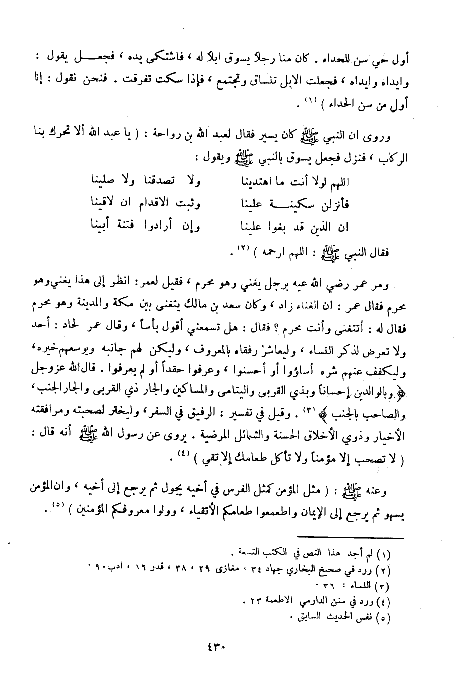 ومر عمر رضي الله عليه برجل يغني وهو محرم، فقيل لعمر: انظر إلى هذا يغني وهو محرم فقال عمر: أن الغناء زاد، وكان سعد بن مالك يتغنى بين مكة والمدينة وهو محرم فقال له: أتتغنى وأنت محرم؟ فقال: هل تسمعني أقول بأسًا، وقال عمر لحاد: أحد ولا تعرض لذكر النساء، وليعاشر رفقاه بالمعروف، وليكن لهم جانبه ويوسعهم خيره، وليكفف عنهم شره أساؤوا أو أحسنوا، وعرفوا حقدًا أو لم يعرفوا. قال الله عز وجل {وبالوالدين إحسانًا وبذي القربي واليتامى والمساكين والجار ذي القربى والجار الجنب، والصاحب بالجنب}. وقيل في تفسير: الرفيق في السفر، وليختر لصحبته ومرافقته الأخيار وذوي الأخلاق الحسنة والشمائل المرضية. يروى عن رسول الله صلى الله عليه وسلم أنه قال: (لا تصحب إلا مؤمنًا ولا تأكل طعامك إلا تقي).