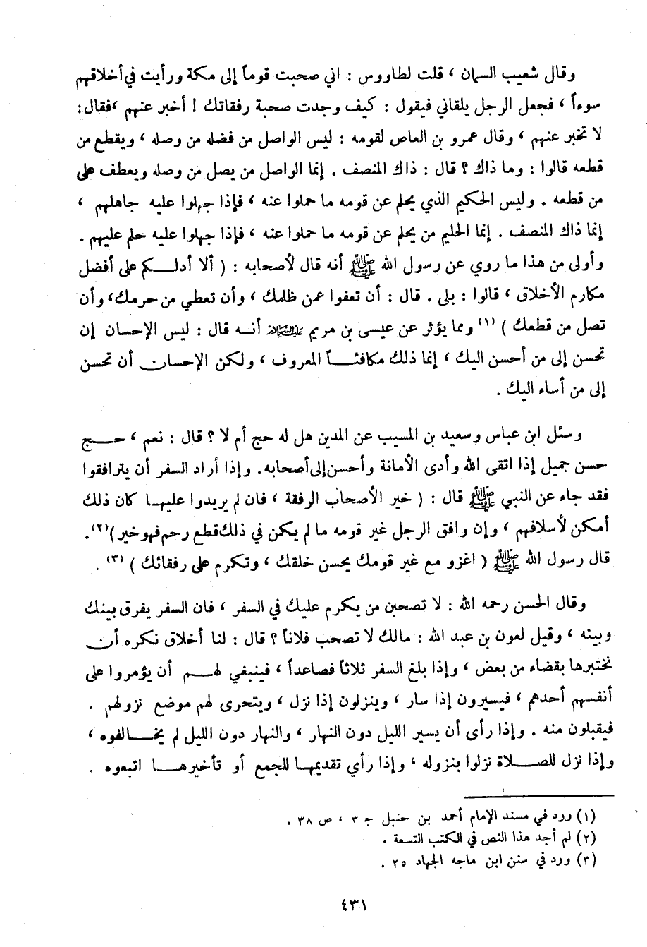 وقال شعيب السمان، قلت لطاووس: إني صحبت قومًا إلى مكة ورأيت في أخلاقهم سوءًا، فجعل الرجل يلقاني فيقول: كيف وجدت صحبة رفقاتك! أخبر عنهم، فقال: لا تخبر عنهم، وقال عمرو بن العاص لقومه: ليس الواصل من فضله من وصله، ويقطع من قطعه قالوا: وما ذاك؟ قال: ذاك المنصف. إنما الواصل من يصل من وصله ويعطف على من قطعه. وليس الحكيم الذي يحلم عن قومه ما حملوا عنه، فإذا جهلوا عليه جاهلهم، إنما ذاك المنصف. إنما الحليم من يحلم عن قومه ما حملوا عنه، فإذا جهلوا عليه حلم عليهم. وأولى من هذا ما روي عن رسول الله صلى الله عليه وسلم أنه قال لأصحابه: (ألا أدلكم على أفضل مكارم الأخلاق، قالوا: بلى. قال: أن تعفوا عمن ظلمك، وأن تعطي من حرمك، وأن تصل من قطعك) ومما يؤثر عن عيسى بن مريم عليه السلام أنه قال: ليس الإحسان إن تحسن إلى من أحسن إليك، إنما ذلك مكافئًا المعروف، ولكن الإحسان أن تحسن إلى من أساء إليك.