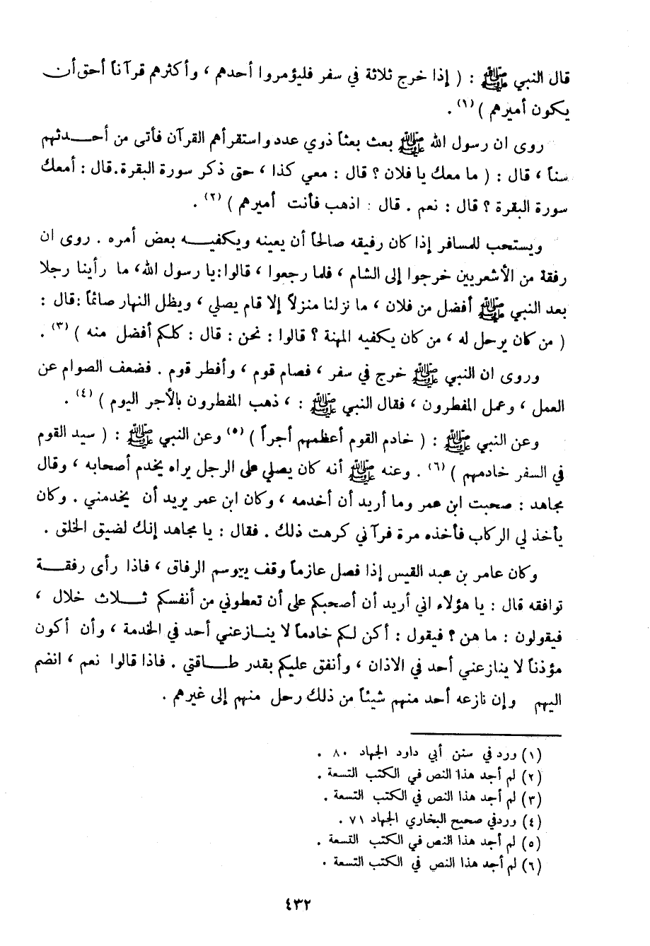 ويستحب للمسافر إذا كان رفيقه صالحًا أن يعينه ويكفيه بعض أمره. روي أن رفقة من الأشعريين خرجوا إلى الشام، فلما رجعوا، قالوا: يا رسول الله، ما رأينا رجلا بعد النبي صلى الله عليه وسلم أفضل من فلان، ما نزلنا منزلاً إلا قام يصلي، ويظل النهار صائمًا: قال: (من كان يرحل له، من كان يكفيه المهنة؟ قالوا: نحن: قال: كلكم أفضل منه).
