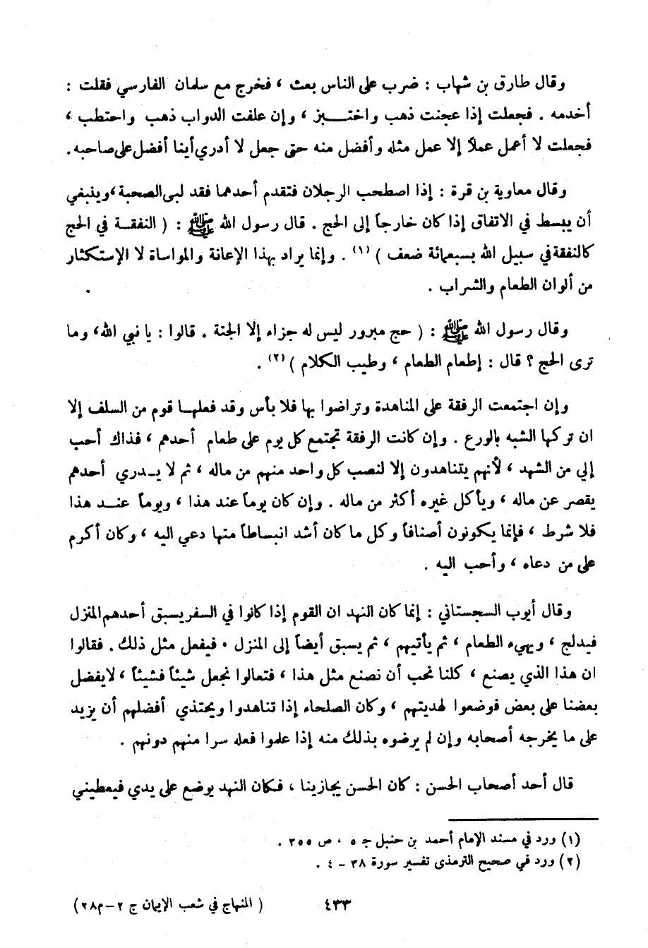 وقال معاوية بن قرة: إذا اصطحب الرجلان فتقدم أحدهما فقد لبى الصحبة، وينبغي أن يبسط في الاتفاق إذا كان خارجًا إلى الحج. قال رسول الله صلى الله عليه وسلم: (النفقة في الحج كالنفقة في سبيل الله بسبعمائة ضعف). وإنما يراد بهذا الإعانة والمواساة لا الإستكثار من ألوان الطعام والشراب.