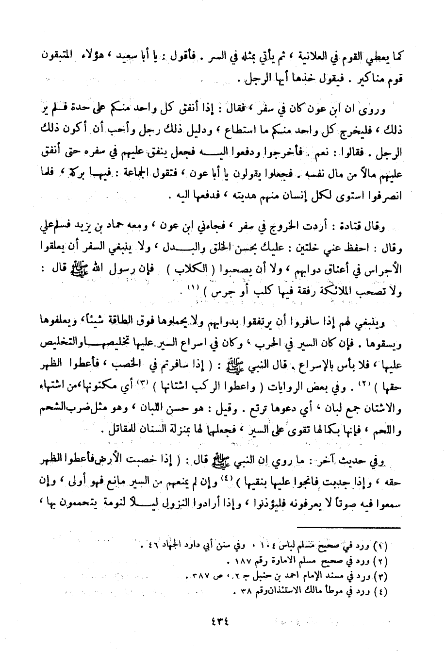 وينبغي لهم إذا سافروا أن يرتفقوا بدوابهم ولا يحملوها فوق الطاقة شيئًا، ويعلفوها ويسقوها. فإن كان السير في الحرب، وكان في إسراع السير عليها تخليصها والتخليص عليها، فلا بأس بالإسراع. قال النبي صلى الله عليه وسلم: (إذا سافرتم في الخصب، فأعطوا الظهر حقها). وفي بعض الروايات (واعطوا الركب اشتانها) أي مكنونها، من اشتهاء والاشتان جمع لبان، أي دعوها ترتع. وقيل: هو حسن اللبان، وهو مثل ضرب الشحم واللحم، فإنها بكمالها تقوى على السير، فجعلهما لها بمنزلة السنان للمقاتل.