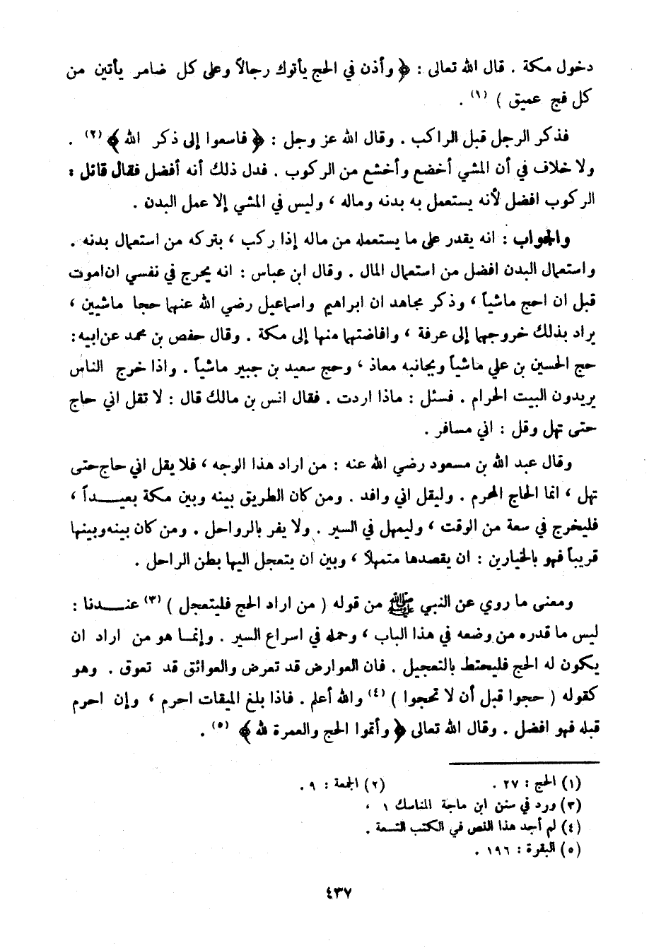 والجواب: أنه يقدر على ما يستعمله من ماله إذا ركب، بتركه من استعمال بدنه. واستعمال البدن أفضل من استعمال المال. وقال ابن عباس: أنه يحرج في نفسي أن أموت قبل أن أحج ماشيًا، وذكر مجاهد أن إبراهيم وإسماعيل رضي الله عنهما حجا ماشيين، يراد بذلك خروجهما إلى عرفة، وافاضتهما منها إلى مكة. وقال حفص بن محمد عن أبيه: حج الحسين بن علي ماشيًا وبجانبه معاذ، وحج سعيد بن جبير ماشيًا. وإذا خرج الناس يريدون البيت الحرام. فسئل: ماذا أردت. فقال أنس بن مالك قال: لا تقل إني حاج حتى تهل وقل: إني مسافر.