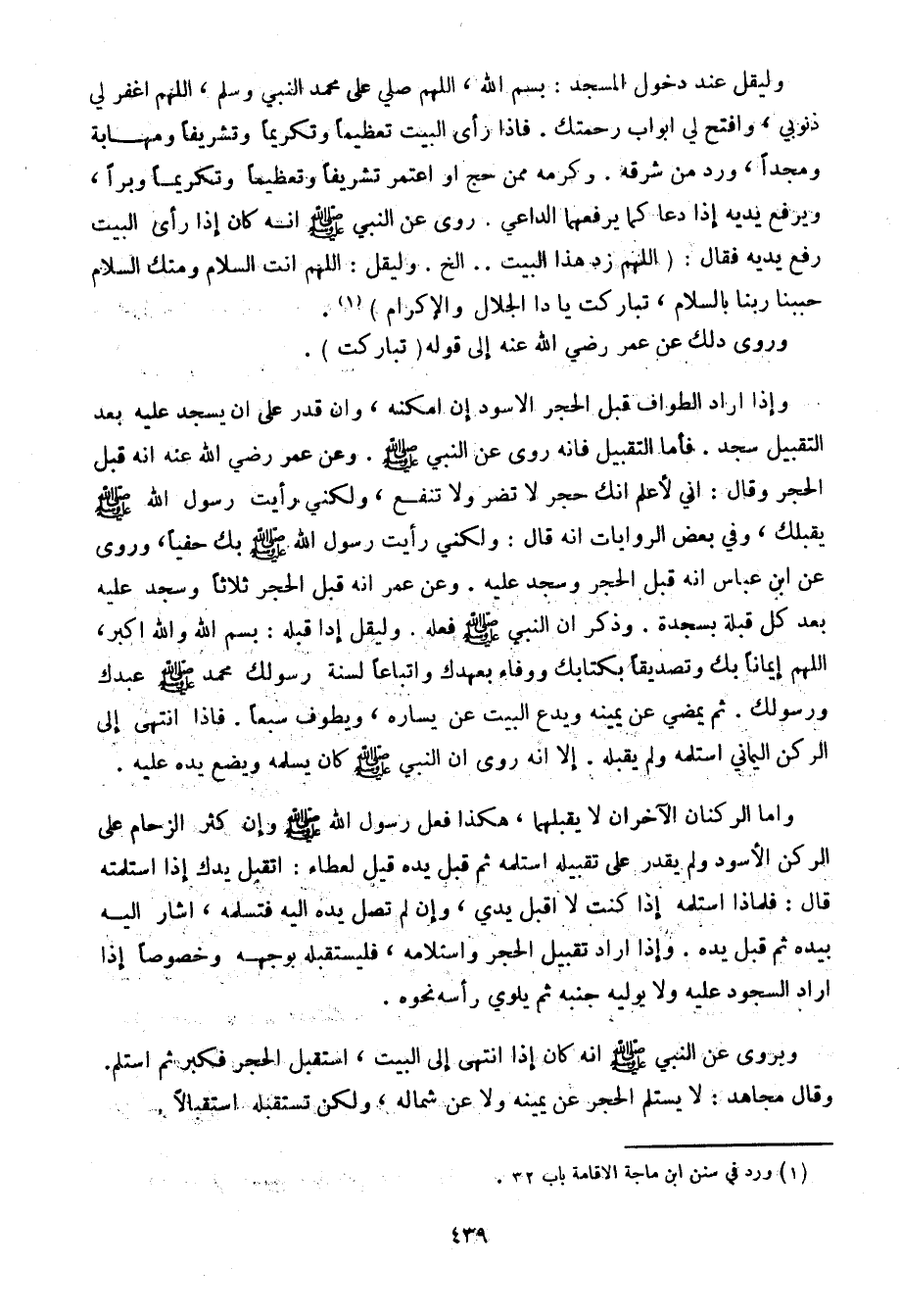 وليقل عند دخول المسجد: بسم الله، اللهم صلي على محمد النبي وسلم، اللهم اغفر لي ذنوبي، وافتح لي أبواب رحمتك. فإذا رأى البيت تعظيمًا وتكريمًا وتشريفًا ومهابة ومجدًا، ورد من شرقه. وكرمه ممن حج أو اعتمر تشريفًا وتعظيمًا وتكريمًا وبرًا، ويرفع يديه إذا دعا كما يرفعهما الداعي .. روى عن النبي صلى الله عليه وسلم أنه كان إذا رأى البيت رفع يديه فقال: (اللهم زد هذا البيت .. الخ. وليقل: اللهم أنت السلام ومنك السلام حببنا ربنا بالسلام، تباركت يا ذا الجلال والإكرام).