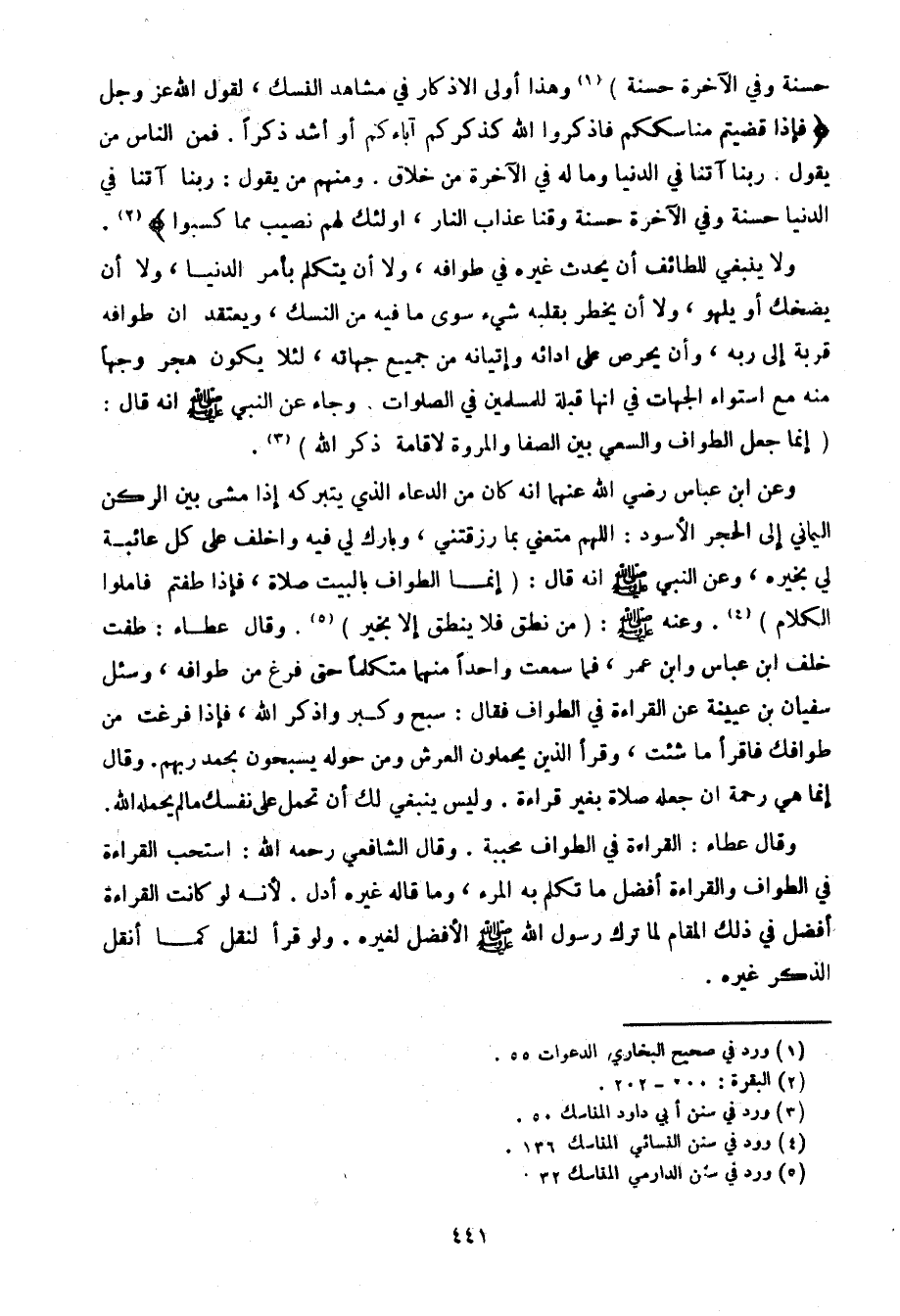 وعن ابن عباس رضي الله عنهما أنه كان من الدعاء الذي يتبركه إذا مشى بين الركن اليماني إلى الحجر الأسود: اللهم متعني بما رزقني، وبارك لي فيه واخلف على كل عائبة لي بخيره، وعن النبي صلى الله عليه وسلم أنه قال: (إنما الطواف بالبيت صلاة، فإذا طفتم فاملوا الكلام). وعنه صلى الله عليه وسلم: (من نطق فلا ينطق إلا بخير). وقال عطاء: طفت خلف ابن عباس وابن عمر، فما سمعت واحدًا منهما متكلمًا حتى فرغ من طوافه، وسئل سفيان بن عيينة عن القراءة في الطواف فقال: سبح وكبر واذكر الله، فإذا فرغت من طوافك فاقرأ ما شئت، وقرأ الذين يحملون العرش ومن حوله يسبحون بحمد ربهم. وقال إنما هي رحمة أن جعله صلاة بغير قراءة. وليس ينبغي لك أن تحمل على نفسك ما لم يحمله الله.