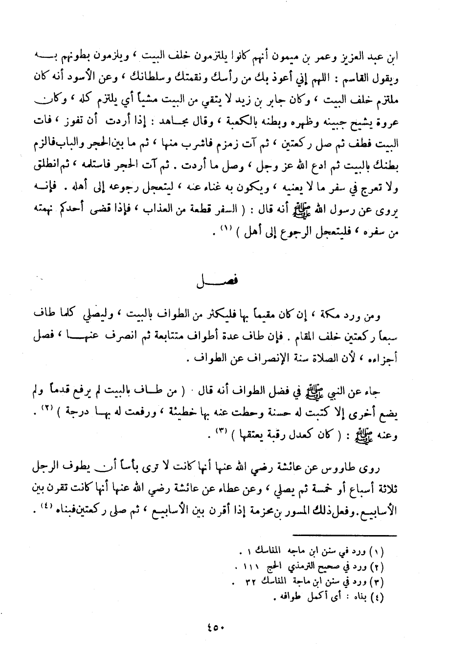 ابن عبد العزيز وعمر بن ميمون أنهم كانوا يلتزمون خلف البيت، ويلزمون بطونهم به ويقولون القاسم: اللهم إني أعوذ بك من رأسك ونقمتك وسلطانك، وعن الأسود أنه كان ملتزم خلف البيت، وكان جابر بن زيد لا يتقي من البيت مشيًا أي يلتزم كله، وكان عروة يشيح جبينه وظهره وبطنه بالكعبة، وقال مجاهد: إذا أردت أن تفوز، فات البيت فطف ثم وصل ركعتين، ثم آت زمزم فاشرب منها، ثم ما بين الحجر والباب فألزم بطنك بالبيت ثم ادع اله عز وجل، وصل ما أردت. ثم آت الحجر فاستلمه، ثم انطلق ولا تعرج في سفر ما لا يعنيه، ويكون به غناء عنه، ليتعجل رجوعه إلى أهله. فإنه يروى عن رسول الله صلى الله عليه وسلم أنه قال: (السفر قطعة من العذاب، فإذا قضى أحدكم نهمته من سفره، فليتعجل الرجوع إلى أهل).