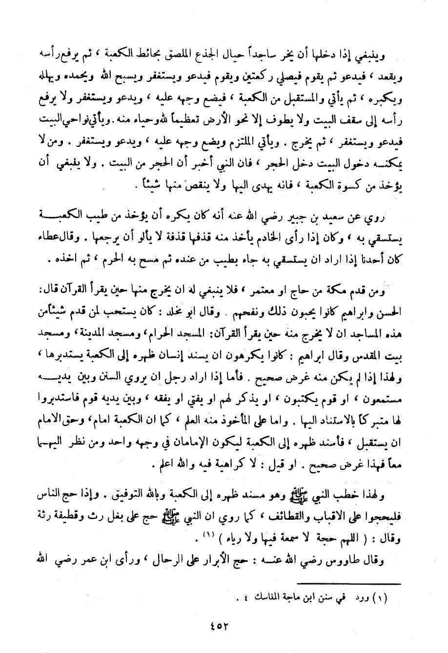 ومن قدم مكة من حاج أو معتمر، فلا ينبغي له أن يخرج منها حين يقرأ القرآن قال: الحسن وإبراهيم كانوا يحبون ذلك ونفحهم. وقال أبو مخلد: كان يستحب لمن قدم شيئًا من هذه المساجد أن لا يخرج منه حين يقرأ القرآن: المسجد الحرام، ومسجد المدينة، ومسجد بيت المقدس وقال إبراهيم: كانوا يكرهون أن يسند إنسان ظهره إلى الكعبة يستدبرها، ولهذا إذا لم يكن منه غرض صحيح. فأما إذا أراد رجل أن يروي السنن وبين يديه مستمعون، أو قوم يكتبون، أو يذكر لهم أو يفتي أو يفقه، وبين يديه قوم فاستدبروا لهم متبركًا بالاستناد إليها. وأما على المأخوذ منه العلم، كما أن الكعبة أمام، وحق الإمام أن يستقبل، فأسند ظهره إلى الكعبة ليكون الإمامان في وجهه واحد ومن نظر إليهما معًا فهذا غرض صحيح. أو قيل: لا كراهية فيه والله أعلم.