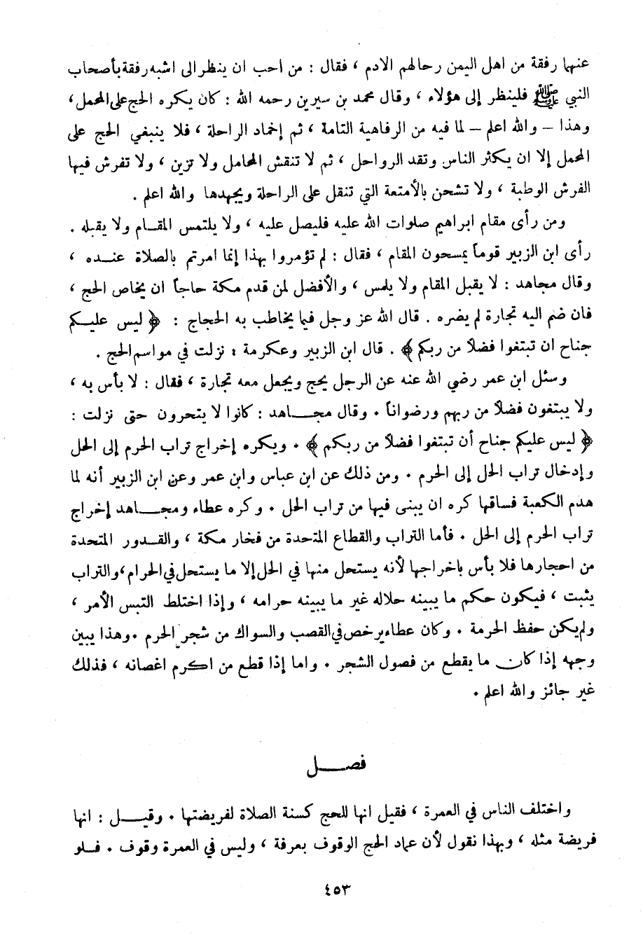 وسئل ابن عمر رضي الله عنه عن الرجل يحج ويجعل معه تجارة، فقال: لا بأس به، ولا يبتغون فضلًا من ربهم ورضوانًا. وقال مجاهد: كانوا لا يتحرون حتى نزلت: {ليس عليكم جناح أن تبتغوا فضلًا من ربكم}. ويكره إخراج تراب الحرم إلى الحل وإدخال تراب الحل إلى الحرم. ومن ذلك عن ابن عباس وابن عمر وعن ابن الزبير أنه لما هدم الكعبة فساقها كره أن يبنى فيها من تراب الحل. وكره عطاء ومجاهد إخراج تراب الحرم إلى الحل. فأما التراب والقطاع المتحدة من فخار مكة، والقدور المتحدة من أحجارها فلا بأس بإخراجها لأنه يستحل منها في الحل إلا ما يستحل في الحرام، والتراب يثبت، فيكون حكم ما يبينه حلاله غير ما يبينه حرامه، وإذا اختلط التبس الأمر، ولم يكن حفظ الحرمة. وكان عطاء يرخص في القصب والسواك من شجر الحرم. وهذا يبين وجهه إذا كان ما يقطع من فصول الشجر. وإما إذا قطع من أكرم أغصانه، فذلك غير جائز والله أعلم.