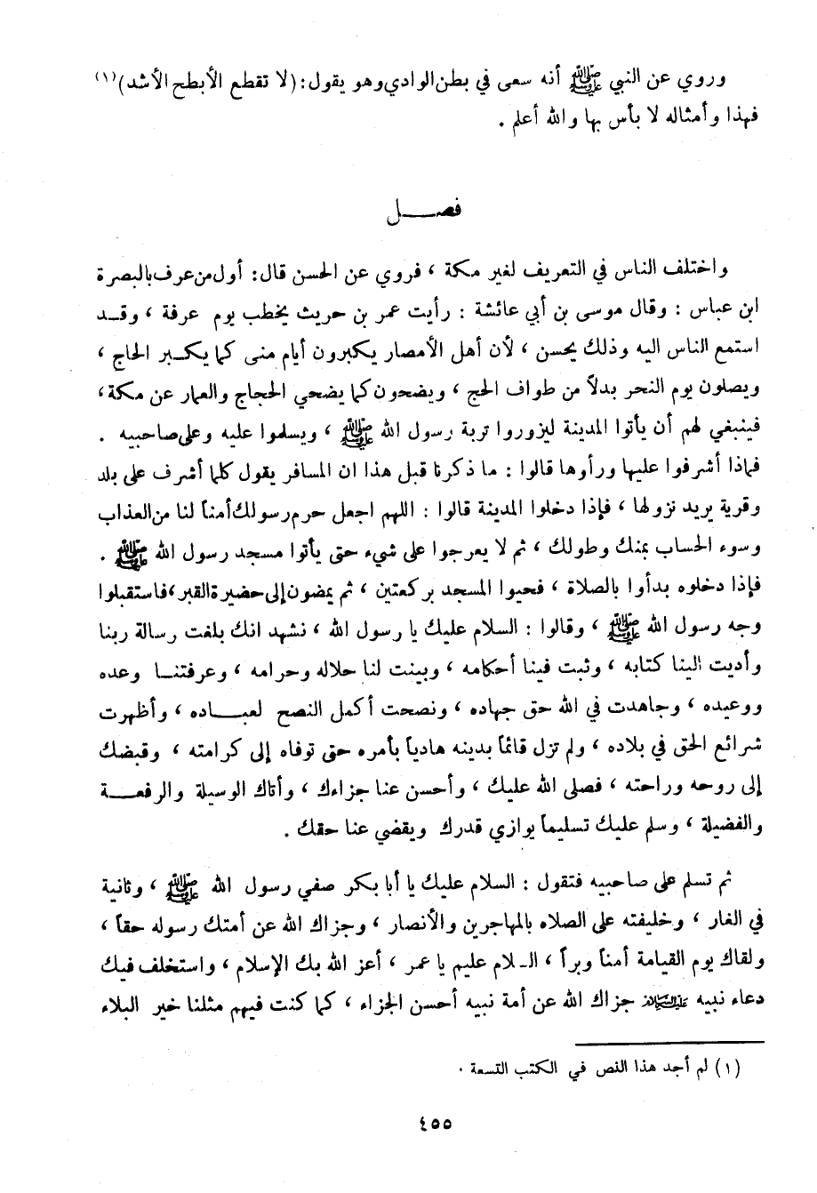 واختلف الناس في التعريف لغير مكة، فروي عن الحسن قال: أول من عرف بالبصرة ابن عباس: وقال موسى بن أبي عائشة: رأيت عمر بن حريث يخطب يوم عرفة، وقد استمع الناس إليه وذلك يحسن، لأن أهل الأمصار يكبرون أيام منى كما يكبر الحج، ويصلون يوم النحر بدلًا من طواف الحج، ويضحون كما يضحى الحجاج والعمار عن مكة، فينبغي لهم أن يأتوا المدينة ليزوروا المدينة تربة رسول الله صلى الله عليه وسلم، ويسلوا عليه وعلى صاحبيه. فماذا أشرفوا عليها ورأوها قالوا: ما ذكرنا قبل هذا أن المسافر يقول كلما أشرف على بلد وقرية يريد نزولها، فإذا دخلوا المدينة قالوا: اللهم أجعل حرم رسولك أمنًا لنا من العذاب وسوء الحساب بمنك وطولك، ثم لا يعرجوا على شيء حتى يأتوا مسجد رسول الله صلى الله عليه وسلم. فإذا دخلوه بدأوا بالصلاة، فحيوا المسجد بركعتين، ثم يمضون إلى حضيرة القبر، فاستقبلوا وجه رسول الله صلى الله عليه وسلم، وقالوا: السلام عليك يا رسول الله، نشهد إنك بلغت رسالة ربنا وأديت إلينا كتابه، وثبت فينا أحكامه، وبينت لنا حلاله وحرامه، وعرفتنا وعده ووعيده، وجاهدت في الله حق جهاده، ونصحت أكمل النصح لعباده، وأظهرت شرائع الحق في بلاده، ولم تزل قائمًا بدينه هاديًا بأمره حتى توفاه إلى كرامته، وقبضك إلى روحه وراحته، فصلى الله عليك، وأحسن عنا جزاءك، وأتاك الوسيلة والرفعة والفضيلة، وسلم عليك تسليمًا يوازي قدرك ويقضي عنك حقك.