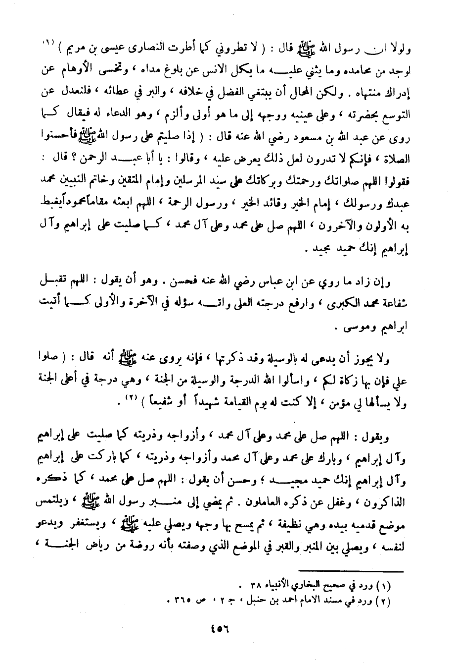 ولولا أن رسول الله صلى الله عليه وسلم قال: (لا تطروني كما أطرت النصارى عيسى بن مريم) لوجد من محامده وما يثني عليه ما يكل الإنس عن بلوغ مداه، وتخسى الأوهام عن إدراك منتهاه. ولكن المحال أن يبتغي الفضل في خلافه، والبر في عطائه، فلنعدل عن التوسع بحضرته، وعلى عينيه ووجهه إلى ما هو أولى وألزم، وهو الدعاء له فيقال كما روي عن عبد الله بن مسعود رضي الله عنه قال: (إذا صليت على رسول الله صلى الله عليه وسلم فأحسنوا الصلاة، فإنكم لا تدرون لعل ذلك يعرض عليه، وقالوا: يا أبا عبد الرحمن؟ قال: فقولوا اللهم صلواتك ورحمتك وبركاته على سيد المرسلين وإمام المتقين وخاتم النبيين محمد عبدك ورسولك، إمام الخير وقائد الخير، ورسول الرحمة، اللهم ابعثه مقامًا محمودًا يغبط به الأولون والآخرون، اللهم صل على محمد وعلى آل محمد، كما صليت على إبراهيم وآل إبراهيم إنك حميد مجيد.