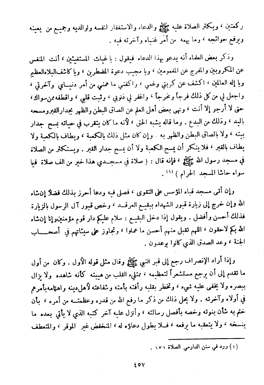 وذكر بعض العلماء أنه يدعو بهذا الدعاء فيقول: يا غياث المستغيثين، أنت المنفس عن المكروبين والمفرج عن المغمومين، ويا مجيب دعوة المضطرين، ويا كاشف البلاء العظيم ويا إله العالمين، اكشف عن كربتي وغمي، واكفني ما همني من أمر دنياي وآخرتي، واجعل لي من كل ذلك فرجًا ومخرجًا، واغفر لي ذنوبي، وثبت قلبي، واقطفه ممن سواك، حتى لا أرجو إلا أنت، ونهى بعض أهل العلم عن الصاق البطن والظهر بجدار القبر ومسحه باليد، وذلك من البدع. وما قاله يشبه الحق، لأنه ما كان يتقرب في حياته بمسح جدار بيته، ولا بإلصاق البطن والظهر به. وإن كان مثل ذلك بالكعبة، ويطاف بالكعبة ولا يطاف بالقبر، فلا ينكر أن يمسح الكعبة ولا يمسح جدار القبر. ويستكثر من الصلاة في مسجد رسول الله صلى الله عليه وسلم، فإنه قال: (صلاة في مسجدي هذا خير من ألف صلاة فيما سواه حاشا الحرام).