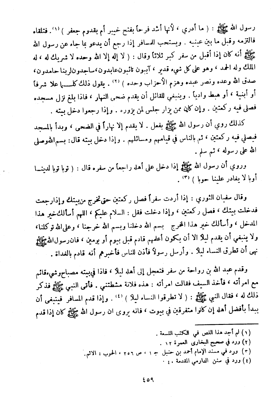 كذلك روي أن رسول الله صلى الله عليه وسلم يفعل. لا يقدم إلا نهارًا في الضحى، وبدأ بالمسجد فيصلي فيه ركعتين، ثم بالناس في قيامهم ومسائلهم. وإذا دخل بيته قال: بسم الله وصلى الله على رسوله، ثم سلم.