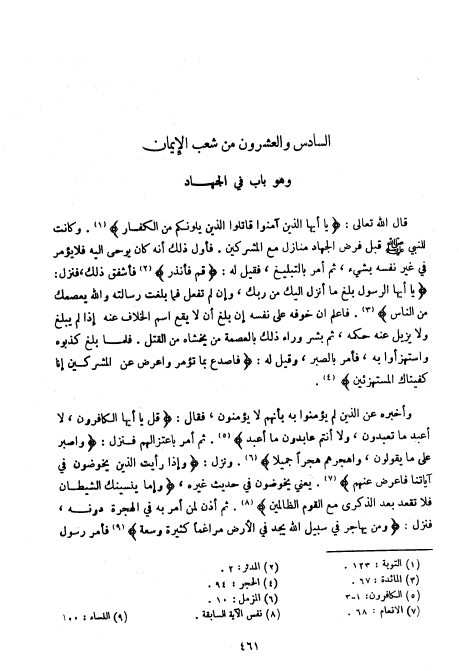 قال الله تعالى: {يا أيها الذين آمنوا قاتلوا الذين يلونكم من الكفار}. وكانت للنبي صلى الله عليه وسلم قبل فرض الجهاد منازل مع المشركين. فأول ذلك أنه كان يوحى إليه فلا يؤمر في غير نفسه بشيء، ثم أمر بالتبليغ، فقيل له: {قم فأنذر} فأشفق ذلك، فنزل: {يا أيها الرسول بلغ ما أنزل إليك من ربك، وإن لم تفعل فما بلغت رسالته والله يعصمك من الناس}. فاعلم أن خوفه على نفسه إن بلغ أن لا يقع اسم الخلاف عنه إذا لم يبلغ ولا يزيل عنه حكمه، ثم بشر وراء ذلك بالعصمة من يخشاه من القتل. فلما بلغ كذبوه واستهزأوا به، فأمر بالصبر، وقيل له: {فاصدع بما تؤمر واعرض عن المشركين إنا كفيناك المستهزئين}.