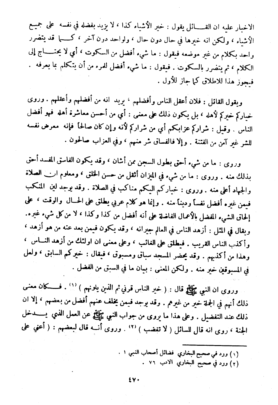وروي أن النبي صلى الله عليه وسلم قال: (خير الناس قرني ثم الذين يلونهم).فكان معنى ذلك أنهم في الجملة خير من غيرهم. وقد يوجد فيمن يخلف عنهم أفضل من بعضهم، إلا أن ذلك عند التفضيل. وعلى هذا ما يروى من جواب النبي صلى الله عليه وسلم عن العمل الذي يدخل الجنة، روي أنه قال للسائل (لا تغضب). وروي أنه قال لبعضهم: (أعني على