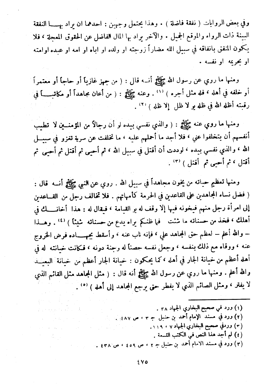 ومنها ما روي عن رسول الله صلى الله عليه وسلم أنه قال: (من جهز غازيًا أو حاجًا أو معتمرًا أو خلفه في أهله، فله مثل أجره). وعنه صلى الله عليه وسلم: (من أعان مجاهدًا أو مكاتبًا في رقبته أظله الله في ظله يوم لا ظل إلا ظله).
