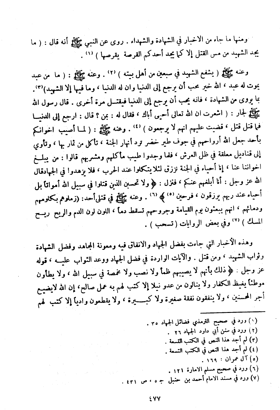 ومنها ما جاء من الأخبار في الشهادة والشهداء. روي عن النبي صلى الله عليه وسلم أنه قال: (ما يجد الشهيد من مس القتل إلا كما يجد أحدكم القرصة يقرصها).