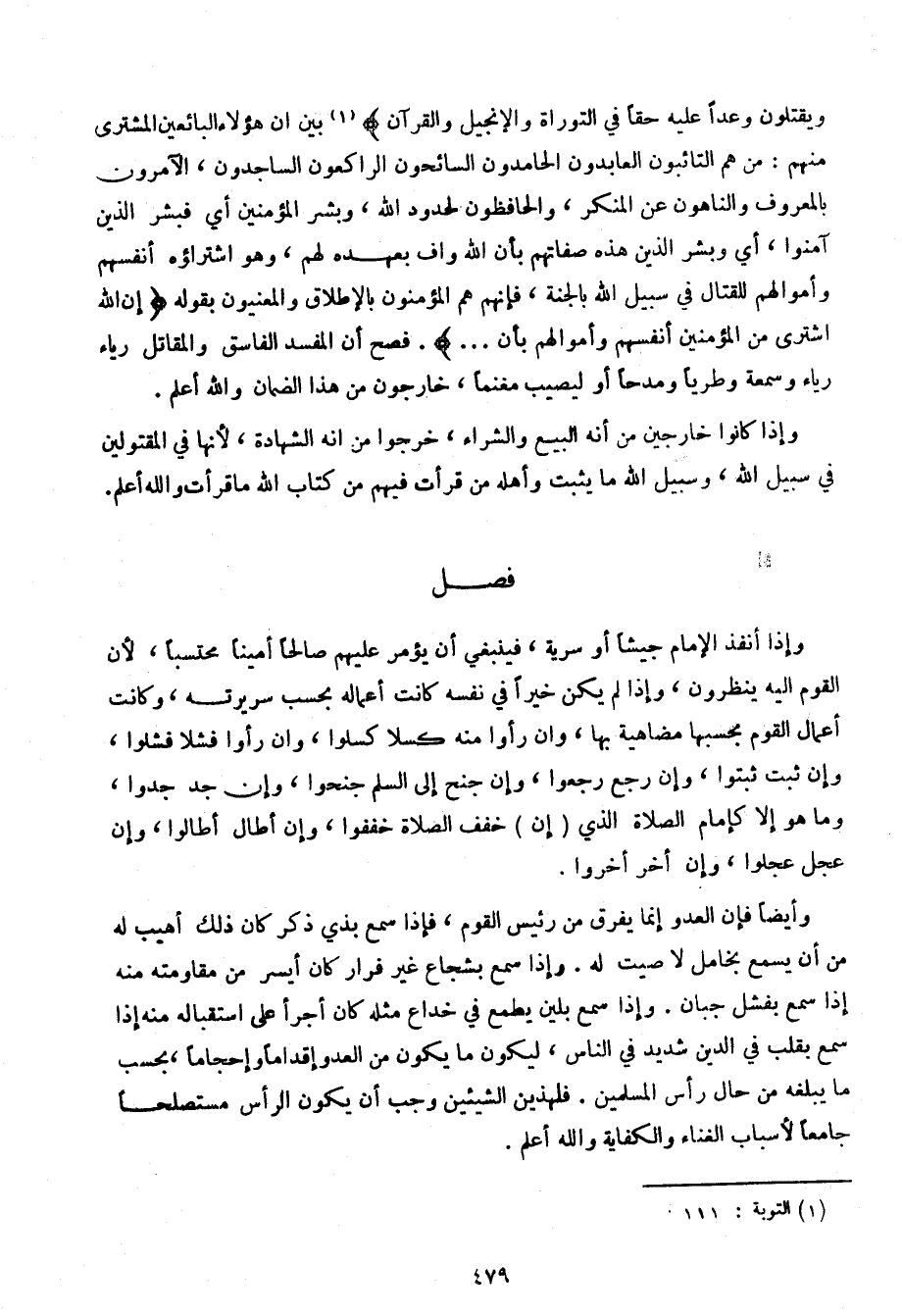 ويقتلون وعدًا عليه حقًا في التوراة والإنجيل والقرآن} بين أن هؤلاء البائعين المشتري منهم: من هم التائبون العابدون الحامدون السائحون الراكعون الساجدون، الآمرون بالمعروف والناهون عن المنكر، والحافظون لحدود الله، وبشر المؤمنين أي فبشر الذين آمنوا، أي وبشر الذين هذه صفاتهم بأن الله واف بعهده لهم، وهو اشتراؤه أنفسهم وأموالهم للقتال في سبيل الله بالجنة، فإنهم هم المؤمنون بالإطلاق والمعنيون بقوله {إن الله اشترى من المؤمنين أنفسهم وأموالهم بأن ...}. فصح أن المفسد الفاسق والمقاتل رياء وسمعة وطريًا ومدحًا أو ليصيب مغنمًا، خارجون من هذا الضمان والله أعلم.