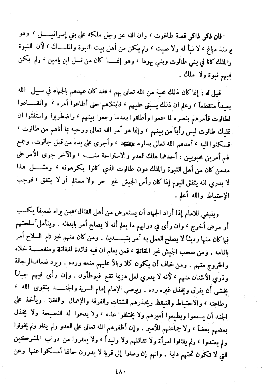 قيل له: إنما كان ذلك محبة من الله تعالى بهم، فقد كان عهدهم بالجهاد في سبيل الله بعيدًا منقطعًا، وعلم أن ذلك يسبق عليهم، فابتلاهم حق أطاعوا أمره، وانقادوا لطالوت فأمرهم بنصره لما سمعوا وأطلقوا بعدما رجعوا بينهم، واضطربوا واستفتوا إن تمليك طالوت ليس رأيًا من بينهم، وإنما هو أمر الله تعالى ووحيه بما أتاهم من طالوت، فسكنوا إليه، أمدهم الله تعالى بداود عليه السلام، وأجرى على يده من قبل جالوت. وجمع لهم أمرين محبوبين: أحدهما هلك العدو والاستراحة منه، والآخر جرى الأمر على مدمن كان من أهل النبوة والملك دون طالوت الذي كانوا يكرهونه، ومثل هذا لا يدري أنه يتفق اليوم إذا كان رأس الجيش غير حر ولا مستلم أو لا يتفق، فوجب الاحتياط والله أعلم.