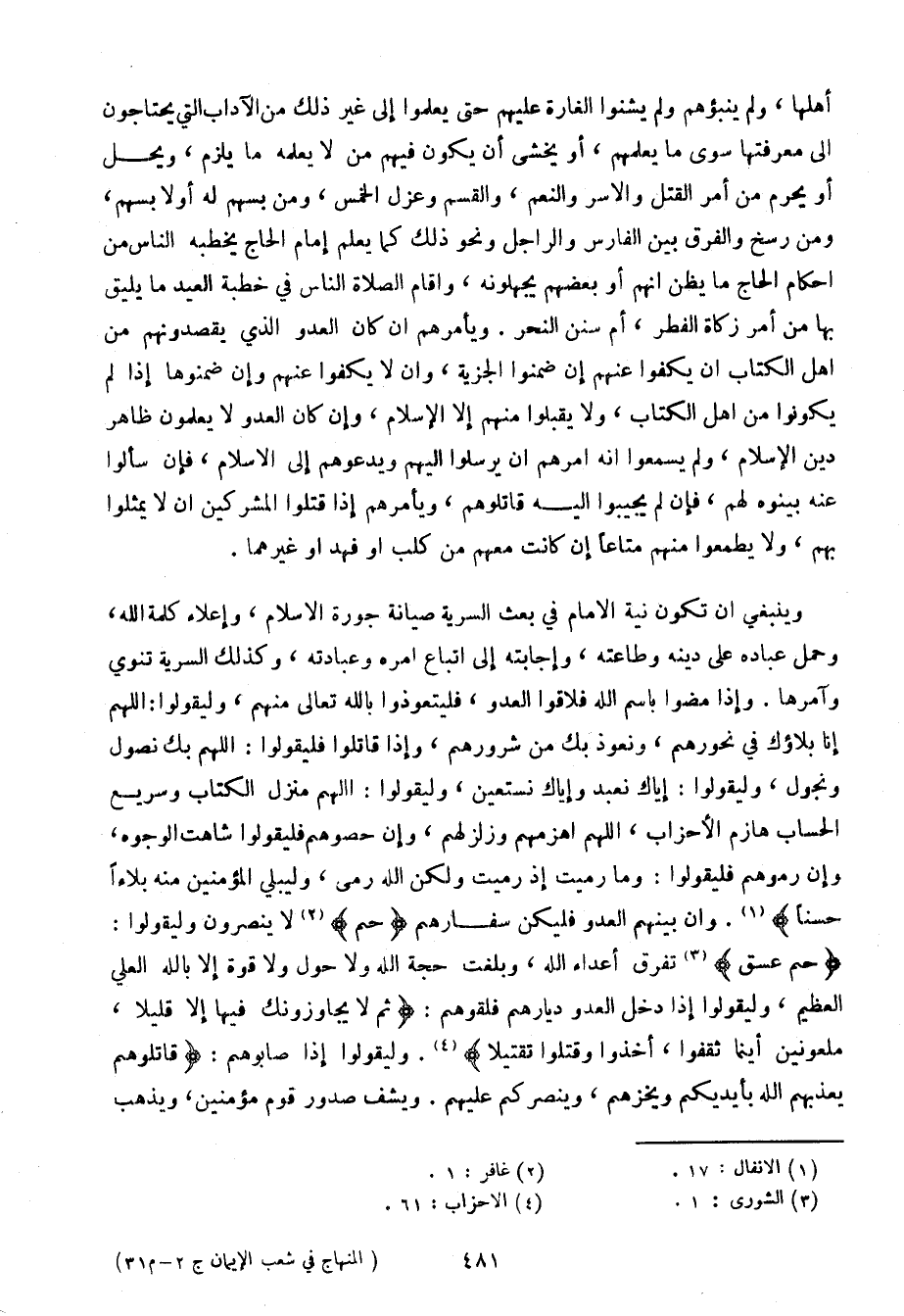 وينبغي أن تكون نية الإمام في بعث السرية صيانة جورة الإسلام، وإعلاء كلمة الله، وحمل عباده على دينه وطاعته، وإجابته إلى إتباع أمره وعبادته، وكذلك السرية تنوي وآمرها. وإذا مضوا باسم الله فلاقوا العدو، فليتعوذوا بالله تعالى منهم، وليقولوا: اللهم إن بلاؤك في نحورهم، ونعوذ بك من شرورهم، وإذا قاتلوا فليقولوا: اللهم بك نصول ونجول، وليقولوا: إياك نعبد وإياك نستعين، وليقولوا: اللهم منزل الكتاب وسريع الحساب هازم الأحزاب، اللهم اهزمهم وزلزلهم، وإن حصوهم فليقولوا شاهت الوجوه، وإن رموهم فليقولوا: {وما رميت إذ رميت ولكن الله رمى، وليبلي المؤمنين منه بلاءًا حسنًا}. وإن بينهم العدو فليكن سفارهم {حم} لا ينصرون وليقولوا: {حم عسق} تفرق أعداء الله، وبلغت حجة الله ولا حول ولا قوة إلا بالله العلي العظيم، وليقولوا إذا دخل العدو ديارهم فلقوهم: {ثم لا يجاوزونك فيها إلا قليلًا، ملعونين أينما ثقفوا، أخذوا وقتلوا تقتيلا}. وليقولوا إذا صابوهم: {قاتلوهم يعذبهم الله بأيديكم ويخزهم، وينصركم عليهم. ويشف صدور قوم مؤمنين، ويذهب