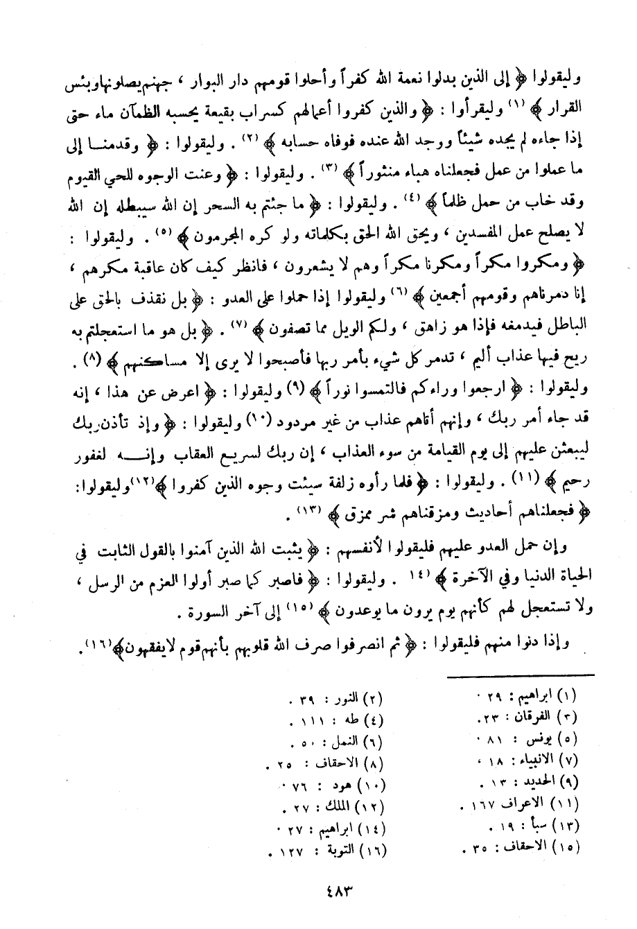 وليقولوا {إلى الذين بدلوا نعمة الله كفرًا وأحلوا قومهم دار البوار، جهنم يصلونها وبئس القرار} وليقرأوا: {والذين كفروا أعمالهم كسراب بقيعة يحسبه الظمآن ماء حتى إذا جاءه لم يجده شيئًا ووجد الله عنده فوفاه حسابه}. وليقولوا: {وقدمنا إلى ما عملوا من عمل فجعلناه هباء منثورًا}. وليقولوا: {وعنت الوجوه للحي القيوم وقد خاب من حمل ظلمًا}. وليقولوا: {ما جئتم به السحر إن الله سيبطله إن الله لا يصلح عمل المفسدين، ويحق الله الحق بكلماته ولو كره المجرمون}. وليقولوا: {ومكروا مكرًا ومكرنا مكرًا وهم لا يشعرون، فانظر كيف كان عاقبة مكرهم، إنا دمرناهم وقومهم أجمعين} وليقولوا إذا حملوا على العدو: {بل نقذف بالحق على الباطل فيدمغه فإذا هو زاهق، ولكم الويل مما تصفون}. {بل هو ما استعجلتم به ريح فيها عذاب أليم، تدمر كل شيء بأمر ربها فأصبحوا لا يرى إلا مساكنهم}. وليقولوا: {ارجعوا وراءكم فالتمسوا نورًا} وليقولوا: {اعرض عن هذا، إنه قد جاء أمر ربك، وإنهم أتاهم عذاب من غير مردود وليقولوا: {وإذا تأذن ربك ليبعثن عليهم إلى يوم القيامة من سوء العذاب، إن ربك لسريع العقاب وإنه لغفور رحيم}. وليقولوا: {فما رأوه زلفة سيئت وجوه الذين كفروا} وليقولوا: {فجعلناهم أحاديث ومزقناهم شر ممزق}.