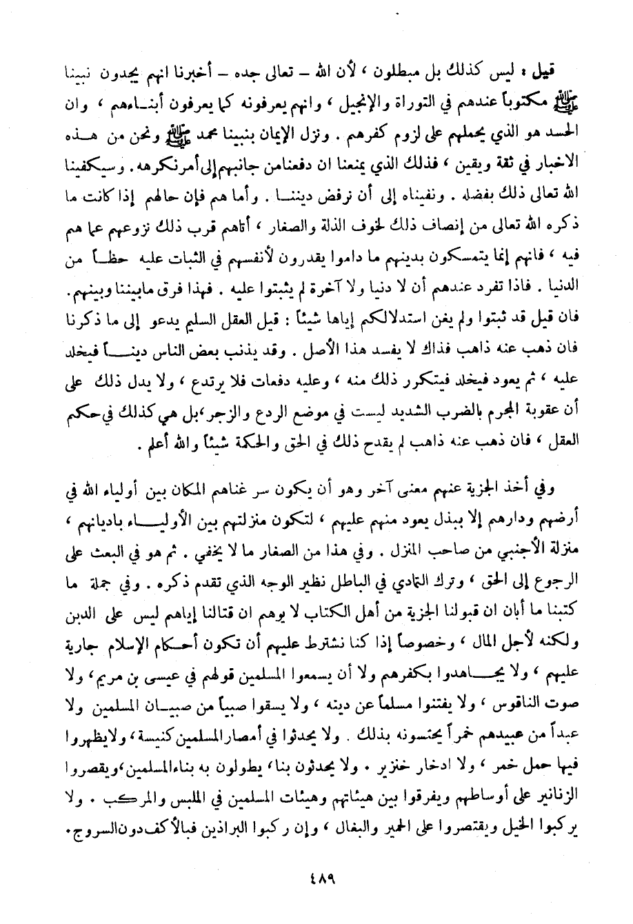 وفي أخذ الجزية عنهم معنى آخر وهو أن يكون سر غناهم المكان بين أولياء الله في أرضهم ودارهم إلا ببذل يعود منهم عليهم، لتكون منزلتهم بين الأولياء بأديانهم، منزلة الأجنبي من صاحب المنزل. وفي هذا من الصغار ما لا يخفى. ثم هو في البعث على الر جوع إلى الحق، وترك التمادي في الباطل نظير الوجه الذي تقدم ذكره. وفي جملة ما كتبنا ما أبان أن قبولنا الجزية من أهل الكتاب لا يوهم أن قتالنا إياهم ليس على الدين ولكنه لأجل المال، وخصوصًا إذا كنا نشترط عليهم أن تكون أحكام الإسلام جارية عليهم، ولا يجاهدوا بكفرهم ولا أن يسمعوا المسلمين قولهم في عيسى بن مريم، ولا صوت الناقوس، ولا يفتنوا مسلمًا عن دينه، ولا يسقوا صبيًا من صبيان المسلمين ولا عبدًا من عبيدهم خمرًا يحتسونه بذلك. ولا يحدثوا في أمصار المسلمين كنيسة، ولا يظهروا فيها حمل خمر، ولا ادخار خنزير. ولا يحدثون بنا، يطولون به بناء المسلمين، ويقصروا الزنانير على أوساطهم ويفرقوا بين هيئاتهم وهيئات المسلمين في الملبس والمركب. ولا يركبوا الخيل ويقتصروا على الحمير والبغال، وإن ركبوا البراذين فبالأكف دون السروج.