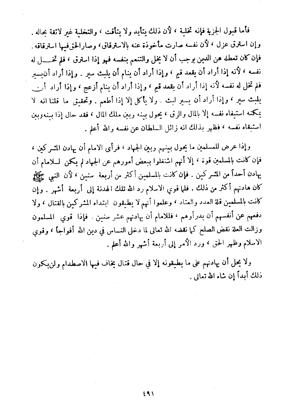 وإذا عرض المسلمين ما يحول بينهم وبين الجهاد، فرأى الإمام أن يهادن المشركين، فإن كانت بالمسلمين قوة، إلا أنهم اشتغلوا ببعض أمورهم عن الجهاد لم يكن للإمام أن يهادن أحدًا من المشركين. فإن كانت بالمسلمين أكثر من أربعة سنين، لأن النبي صلى الله عليه وسلم كان هادنهم أكثر من ذلك. فلما قوي الإسلام رد الله تلك الهدنة إلى أربعة أشهر. وإن كانت بالمسلمين قلة العدد والعتاد، وعلموا أنهم لا يطيقون ابتداء المشركين بالقتال، ولا دفعهم عن أنفسهم أن يدرأوهم، فللإمام أن يهادنهم عشر سنين. فإذا قوى المسلمون وزالت العلة نقض الصلح كما نقضه الله تعالى لما دخل الناس في دين الله أفواجًا، وقوي الإسلام وظهر الحق، ورد الأمر إلى أربعة أشهر والله أعلم.