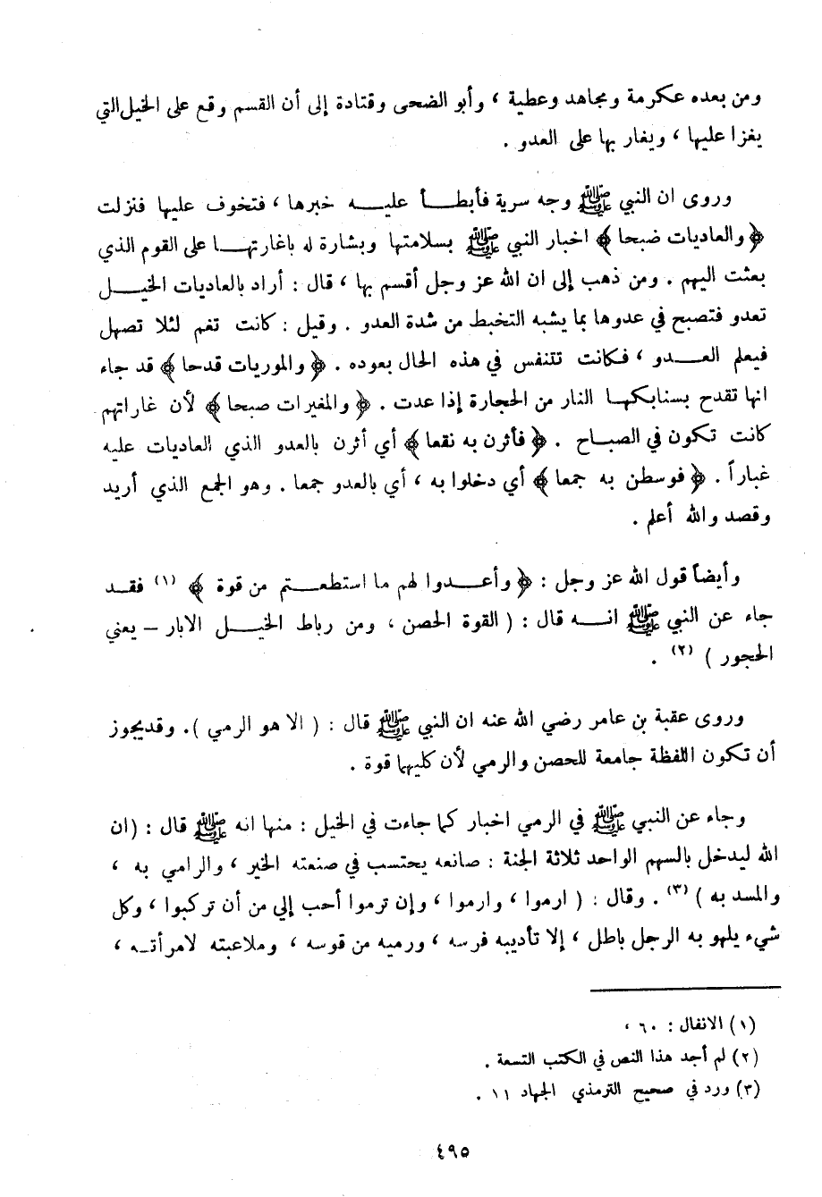 وجاء عن النبي صلى الله عليه وسلم في الرمي إخبار كما جاءت في الخيل: منها إنه صلى الله عليه وسلم قال: (إن الله ليدخل بالسهم الواحد ثلاثة الجنة: صانعه يحتسب في صنعته الخير، والرامي به، والمسد به). وقال: (ارموا، وارموا، وإن ترموا أحب إلي من أن تركبوا، وكل شيء يلهو به الرجل باطل، إلا تأديبه فرسه، ورميه من قوسه، وملاعبته لامرأته،