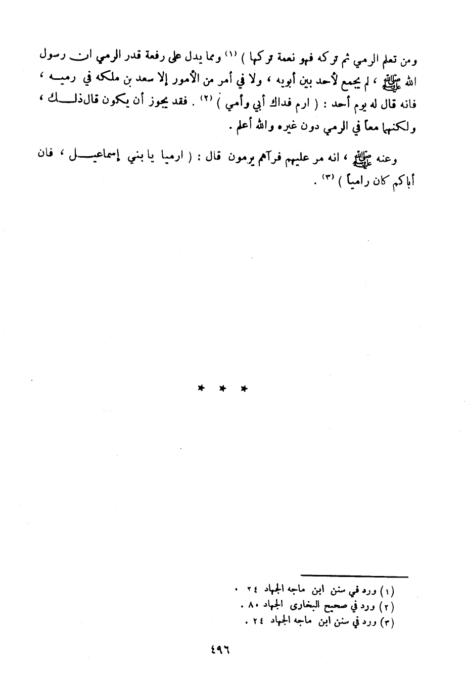 ومن تعلم الرمي ثم تركه فهو نعمة تركها) ومما يدل على رفعة قدر الرمي إن رسول الله صلى الله عليه وسلم، لم يجمع لأحد بين أبويه، ولا في أمر من الأمور غلا سعد بن ملكه في رميه، فإنه قال له يوم أحد: (ارم فداك أبي وأمي). فقد يجوز أن يكون قال ذلك، ولكنهما معًا في الرمي دون غيره والله أعلم.