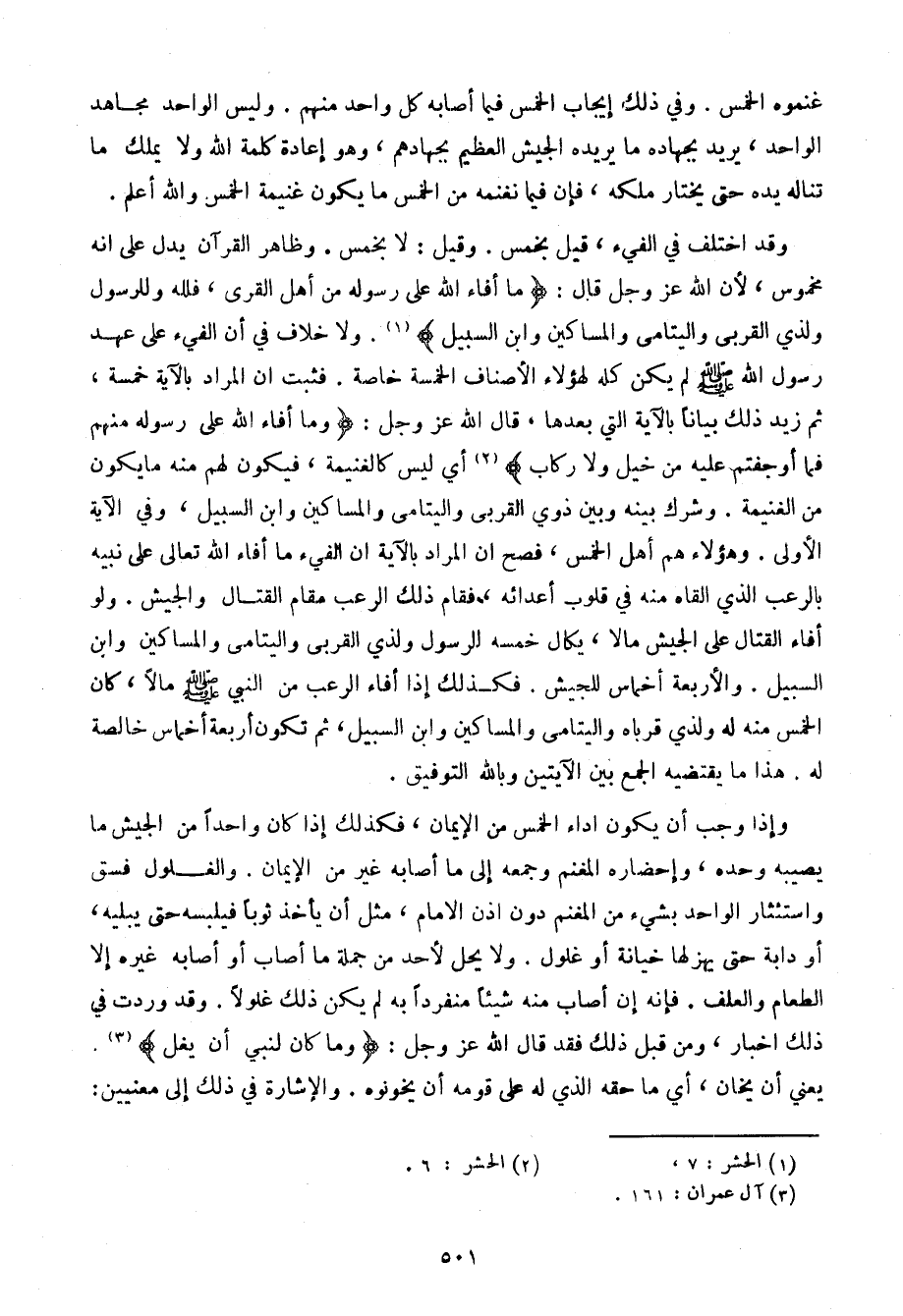 وقد اختلف في الفيء، قيل بخمس. وقيل: لا بخمس. وظاهر القرآن يدل على أنه مخموس، لأن الله عز وجل قال: {ما أفاء الله على رسوله من أهل القرى، فلله وللرسول ولذي القربى واليتامى والمساكين وابن السبيل}. ولا خلاف في أن الفيء على عهد رسول الله صلى الله عليه وسلم لم يكن كله لهؤلاء الأصناف الخمسة خاصة. فثبت أن المراد بالآية خمسة، ثم زيد ذلك بيانًا بالآية التي بعدها، قال الله عز وجل: {وما أفاء الله على رسوله منهم فما أوجفتم عليه من خيل ولا ركاب} أي ليس كالغنيمة، فيكون لهم منه ما يكون من الغنيمة. وشرك بينه وبين ذوي القربى واليتامى والمساكين وابن السبيل، وفي الآية الأولى. وهؤلاء هم أهل الخمس، فصح أن المراد بالآية أن الفيء ما أفاء الله تعالى على نبيه بالرعب الذي ألقاه منه في قلوب أعدائه، فقام ذلك الرعب مقام القتال والجيش. ولو أفاء القتال على الجيش مالًا، يكال خمسه للرسول ولذي القربى واليتامى والمساكين وابن السبيل. والأربعة أخماس للجيش. فكذلك إذا أفاء الرعب من النبي صلى الله عليه وسلم مالًا، كان الخمس منه له ولذي قرباه واليتامى والمساكين وابن السبيل، ثم تكون أربعة أخماس خالصة له. هذا ما يقضيه الجمع بين الآيتين وبالله التوفيق.