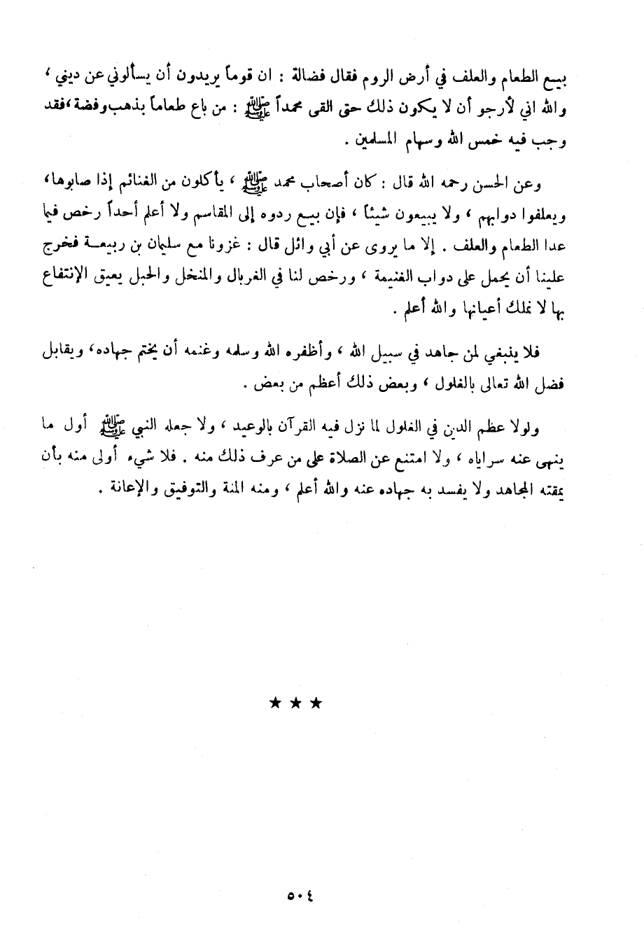 وعن الحسن رحمه الله قال: كان أصحاب محمد صلى الله عليه وسلم، يأكلون من الغنائم إذا صابوها، ويعفوا دوابهم، ولا يبيعون شيئًا، فإن بيع ردوه إلى المقاسم ولا أعلم أحدًا رخص فيما عدا الطعام والعلف. إلا ما يروى عن أبي وائل قال: غزونا مع سليمان بن ربيعة فخرج علينا أن يحمل على دواب الغنيمة، ورخص لنا في الغربال والمنخل والحبل يعيق الانتفاع بها لا نملك أعيانها والله أعلم.