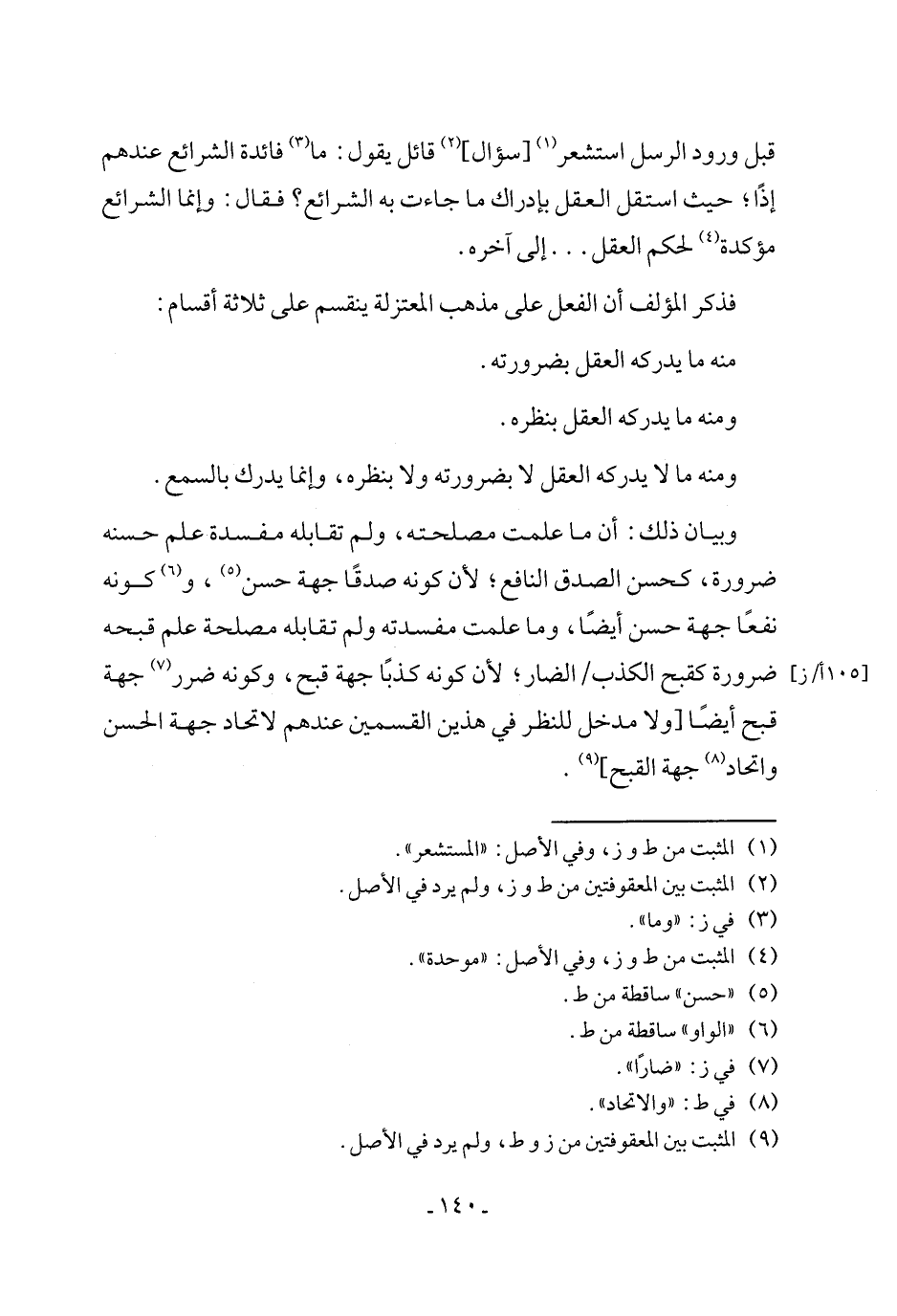 وبيان ذلك: أن ما علمت مصلحته، ولم تقابله مفسدة علم حسنه ضرورة، كحسن الصدق النافع؛ لأن كونه صدقًا جهة حسن (٥)، و (٦) كونه نفعًا جهة حسن أيضًا، وما علمت مفسدته ولم تقابله مصلحة علم قبحه ضرورة كقبح الكذب الضار؛ لأن كونه كذبًا جهة قبح، وكونه ضرر (٧) جهة قبح أيضًا [ولا مدخل للنظر في هذين القسمين عندهم لاتحاد جهة الحسن واتحاد (٨) جهة القبح] (٩).