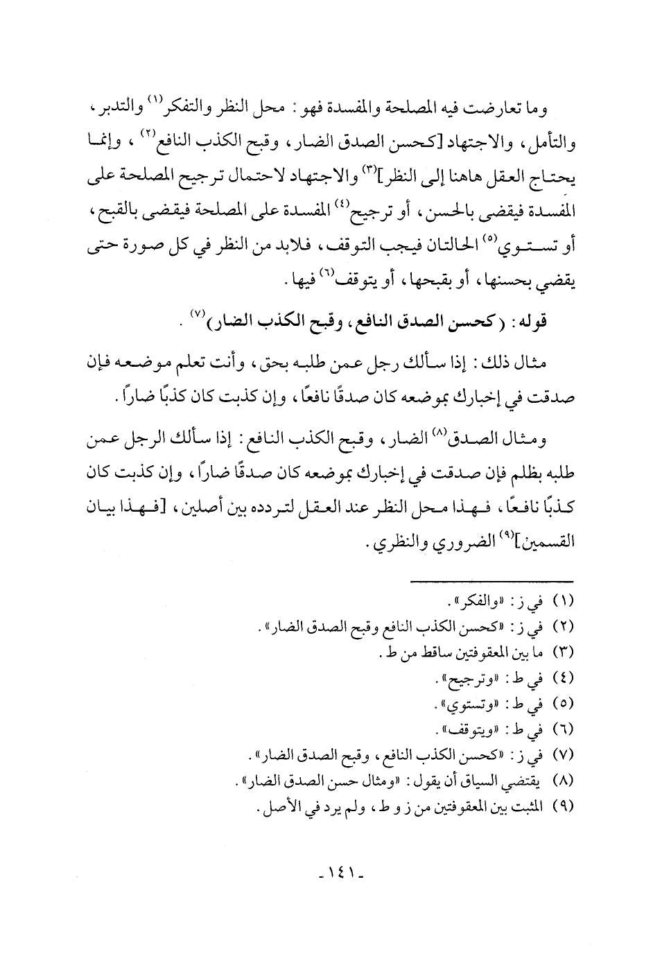 وما تعارضت فيه المصلحة والمفسدة فهو: محل النظر والتفكر (١) والتدبر، والتأمل، والاجتهاد [كحسن الصدق الضار، وقبح الكذب النافع (٢)، وإنما يحتاج العقل ها هنا إلى النظر] (٣) والاجتهاد لاحتمال ترجيح المصلحة على المَفسدة فيقضى بالحسن، أو ترجيح (٤) المفسدة على المصلحة فيقضى بالقبح، أو تستوي (٥) الحالتان فيجب التوقف، فلا بد من النظر في كل صورة حتى يقضي بحسنها، أو بقبحها، أو يتوقف (٦) فيها.