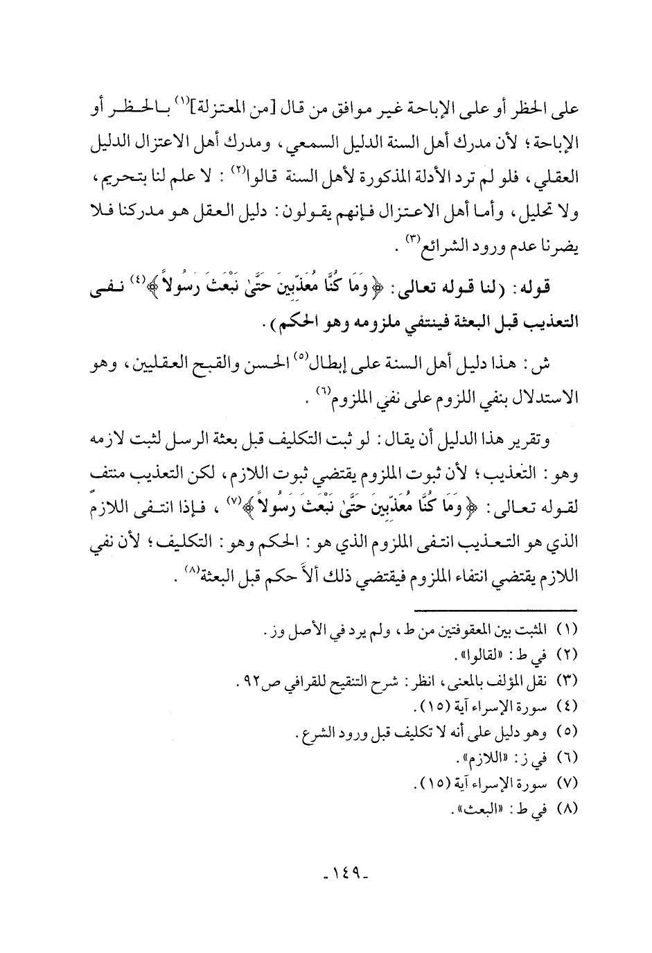 قوله: (لنا قوله تعالى: {وَمَا كُنَّا مُعَذِّبِينَ حَتَّى نَبْعَثَ رَسُولًا} (٤) نفى التعذيب قبل البعثة فينتفي ملزومه وهو الحكم).