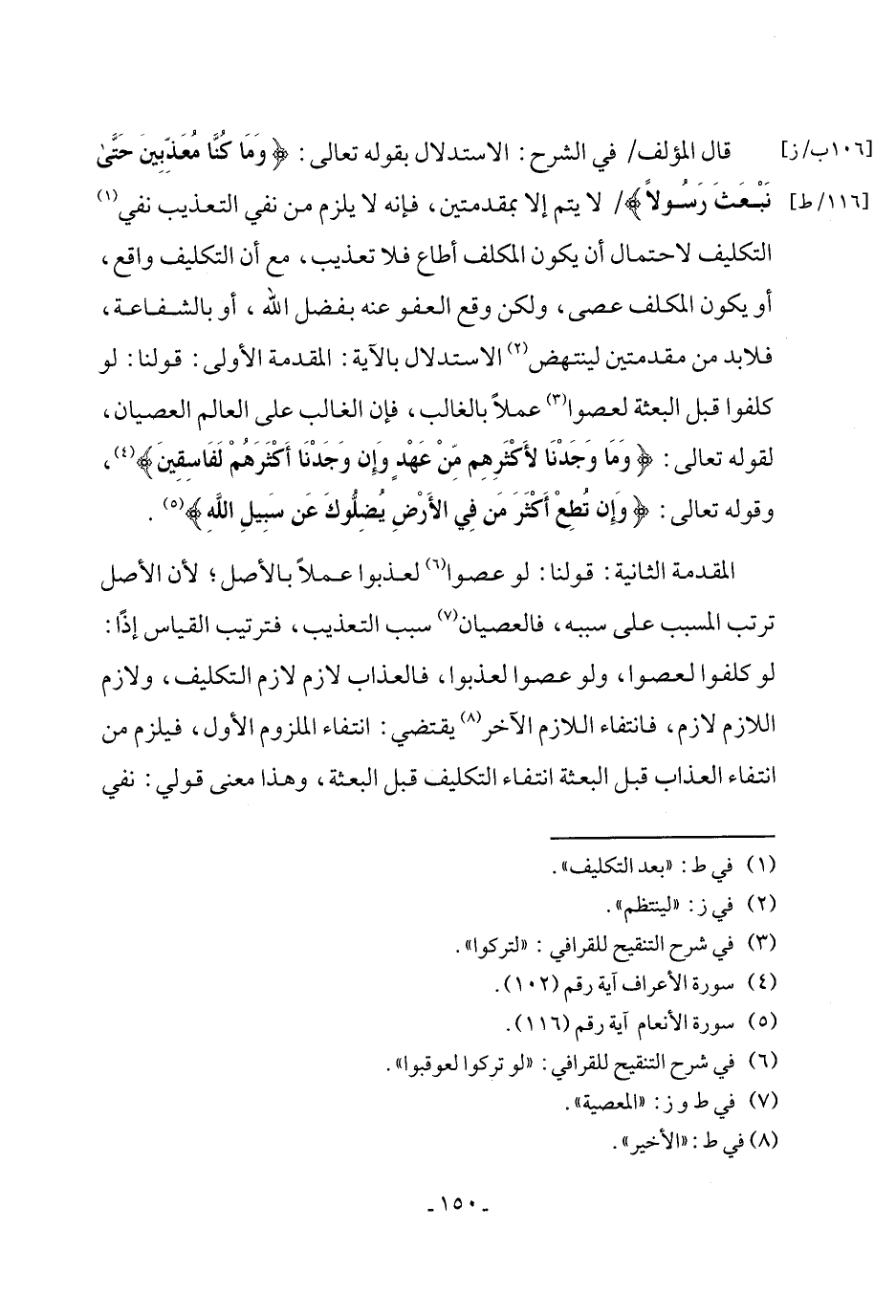 قال المؤلف في الشرح: الاستدلال بقوله تعالى: {وَمَا كُنَّا مُعَذِّبِينَ حَتَّى نَبْعَثَ رَسُولًا} لا يتم إلا بمقدمتين، فإنه لا يلزم من نفي التعذيب نفي (١) التكليف لاحتمال أن يكون المكلف أطاع فلا تعذيب، مع أن التكليف واقع، أو يكون المكلف عصى، ولكن وقع العفو عنه بفضل الله، أو بالشفاعة، فلا بد من مقدمتين لينتهض (٢) الاستدلال بالآية: المقدمة الأولى: قولنا: لو كلفوا قبل البعثة لعصوا (٣) عملاً بالغالب، فإن الغالب على العالم العصيان، لقوله تعالى: {وَمَا وَجَدْنَا لِأَكْثَرِهِمْ مِنْ عَهْدٍ وَإِنْ وَجَدْنَا أَكْثَرَهُمْ لَفَاسِقِينَ} (٤)، وقوله تعالى: {وَإِنْ تُطِعْ أَكْثَرَ مَنْ فِي الْأَرْضِ يُضِلُّوكَ عَنْ سَبِيلِ اللَّهِ} (٥).