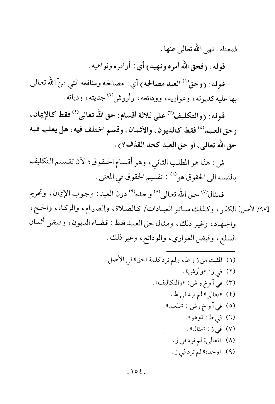 قوله: (والتكليف (٣) على ثلاثة أقسام: حق الله تعالى (٤) فقط كالإِيمان، وحق العبد (٥) فقط كالديون، والأثمان، وقسم اختلف فيه، هل يغلب فيه حق الله تعالى، أو حق العبد كحد القذف؟).