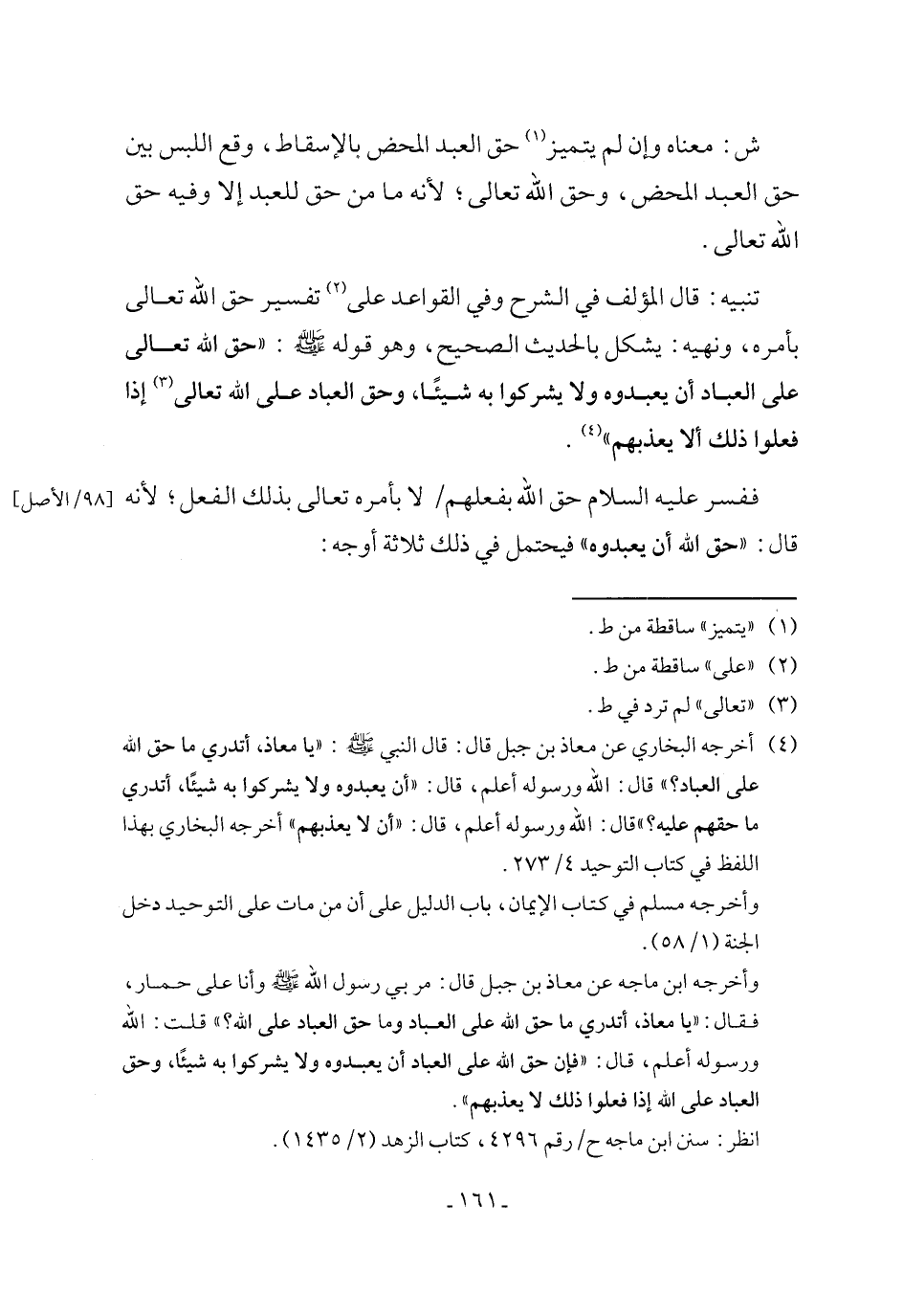 (٤) أخرجه البخاري عن معاذ بن جبل قال: قال النبي - صلى الله عليه وسلم -: "يا معاذ، أتدري ما حق الله على العباد؟ " قال: الله ورسوله أعلم، قال: "أن يعبدوه ولا يشركوا به شيئًا، أتدري ما حقهم عليه؟ " قال: الله ورسوله أعلم، قال: "أن لا يعذبهم" أخرجه البخاري بهذا اللفظ في كتاب التوحيد ٤/ ٢٧٣.