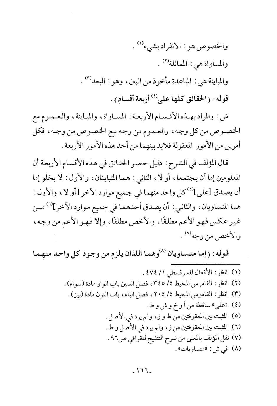 ش: والمراد بهذه الأقسام الأربعة: المساواة، والمباينة، والعموم مع الخصوص من كل وجه، والعموم من وجه مع الخصوص من وجه، فكل أمرين من الأمور المعقولة فلا بد بينهما من أحد هذه الأمور الأربعة.