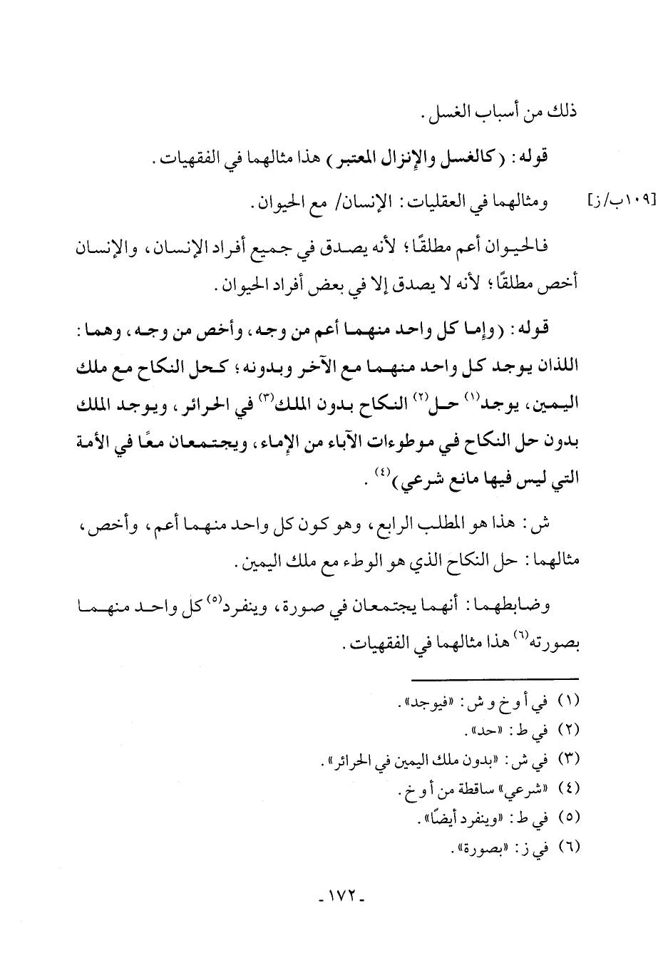 قوله: (وإِما كل واحد منهما أعم من وجه، وأخص من وجه، وهما: اللذان يوجد كل واحد منهما مع الآخر وبدونه؛ كحل النكاح مع ملك اليمين، يوجد (١) حل (٢) النكاح بدون الملك (٣) في الحرائر، ويوجد الملك بدون حل النكاح في موطوءات الآباء من الإِماء، ويجتمعان معًا في الأمة التي ليس فيها مانع شرعي) (٤).