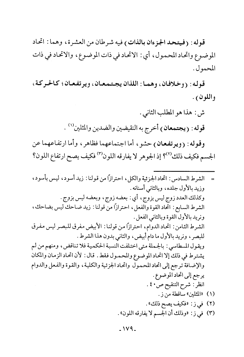 قوله: (فيتحد الجزءان بالذات) فيه شرطان من العشرة، وهما: اتحاد الموضوع واتحاد المحمول، أي: الاتحاد في ذات الموضوع، والاتحاد في ذات المحمول.