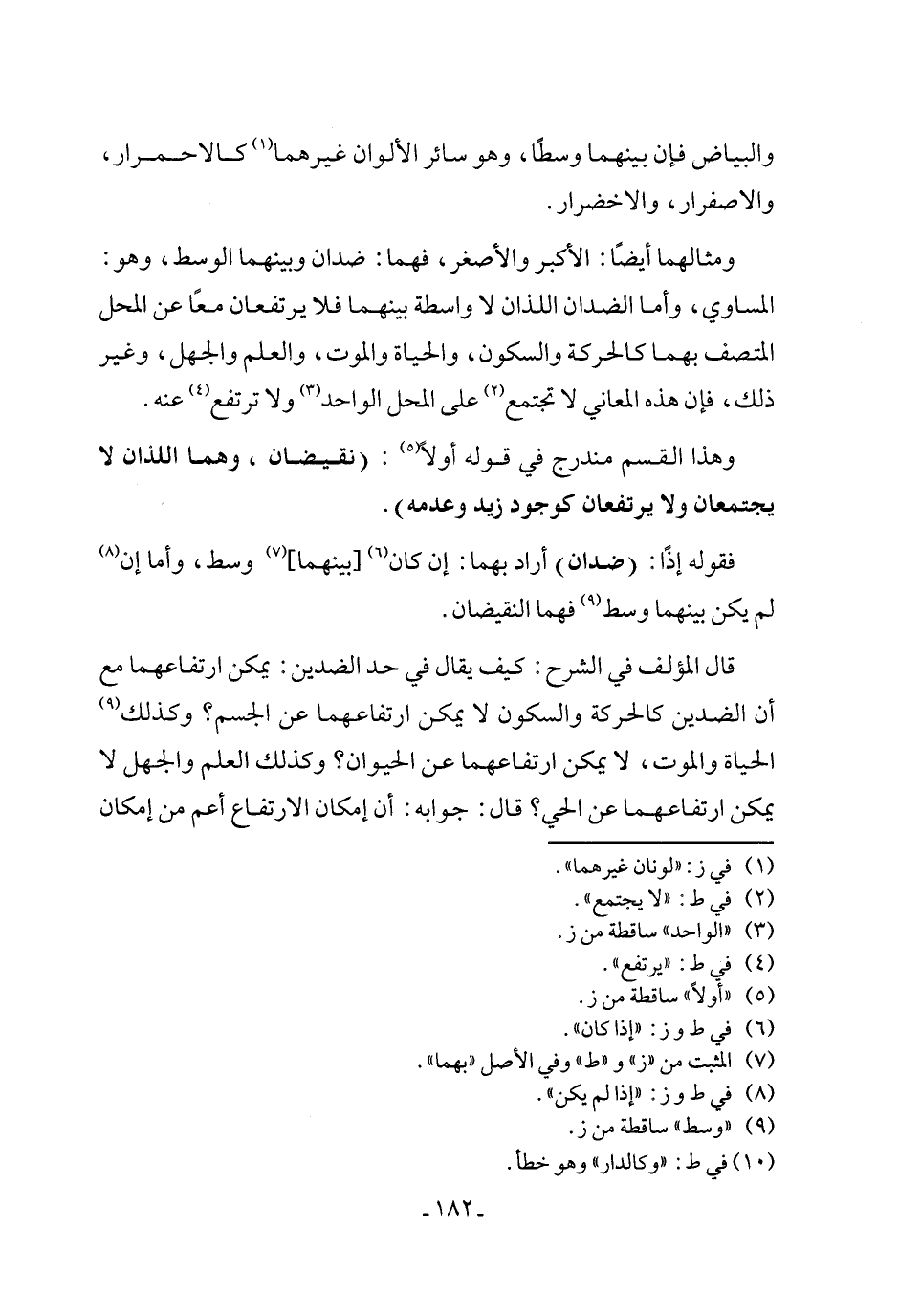 قال المؤلف في الشرح: كيف يقال في حد الضدين: يمكن ارتفاعهما مع أن الضدين كالحركة والسكون لا يمكن ارتفاعهما عن الجسم؟ وكذلك (١٠) الحياة والموت، لا يمكن ارتفاعهما عن الحيوان؟ وكذلك العلم والجهل لا يمكن ارتفاعهما عن الحي؟ قال: جوابه: أن إمكان الارتفاع أَعم من إمكان